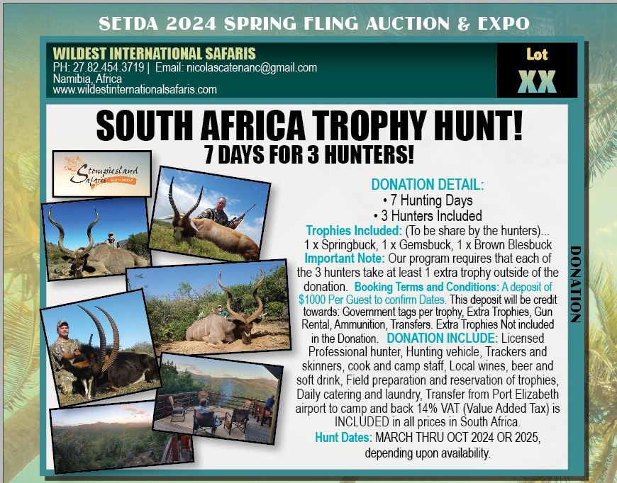 Donation Includes: Licensed Professional hunter, Hunting vehicle, Trackers and skinners, cook and camp staff, Local wines, beer and soft drink, Field preparation and reservation of trophies, Daily catering and laundry, Transfer from Port Elizabeth airport to camp and back, 14% VAT (Value Added Tax) is INCLUDED in all prices in South Africa.