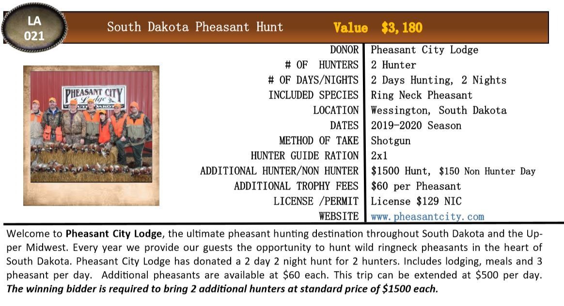 The winning bidder is required to bring 2 additional hunters at standard price of $1500 each. Huntis for 2 hunters for 2 days and 2 nights during the 2019 or 2020 Season. Hunt takes place at lodge in Wessington, South Dakota. www.pheasantcity.com