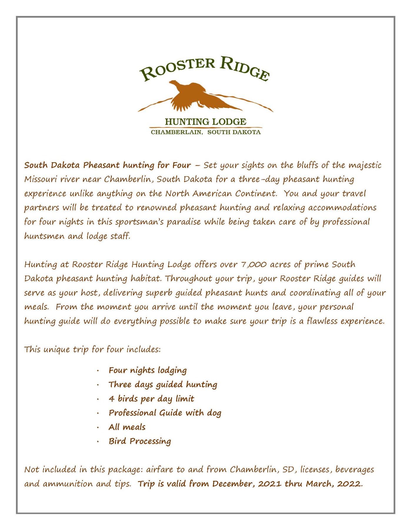 Set your sights on the bluffs of the majestic Missouri river near Chamberlin, South Dakota for a three day pheasant hunting experience unlike anything on the North American Continent. You and your travel partners will be treated to renowned pheasant hunting and relaxing accommodations for four nights in this sportsman’s paradise while being taken care of by professional huntsmen and lodge staff. Hunting at Rooster Ridge Hunting Lodge offers over 7,000 acres of prime South Dakota pheasant hunting habitat. Throughout your trip, your Rooster Ridge guides will serve as your host, delivering superb guided pheasant hunts and coordinating all of your meals. From the moment you arrive until the moment you leave, your personal hunting guide will do everything possible to make sure your trip is a flawless experience. This unique trip for four includes: ? Four nights lodging ? Three days guided hunting ? 4 birds per day limit ? Professional Guide with dog ? All meals ? Bird Processing Not included in this package: airfare to and from Chamberlin, SD, licenses, beverages and ammunition and tips. Trip is valid from December, 2020 thru March, 2021.