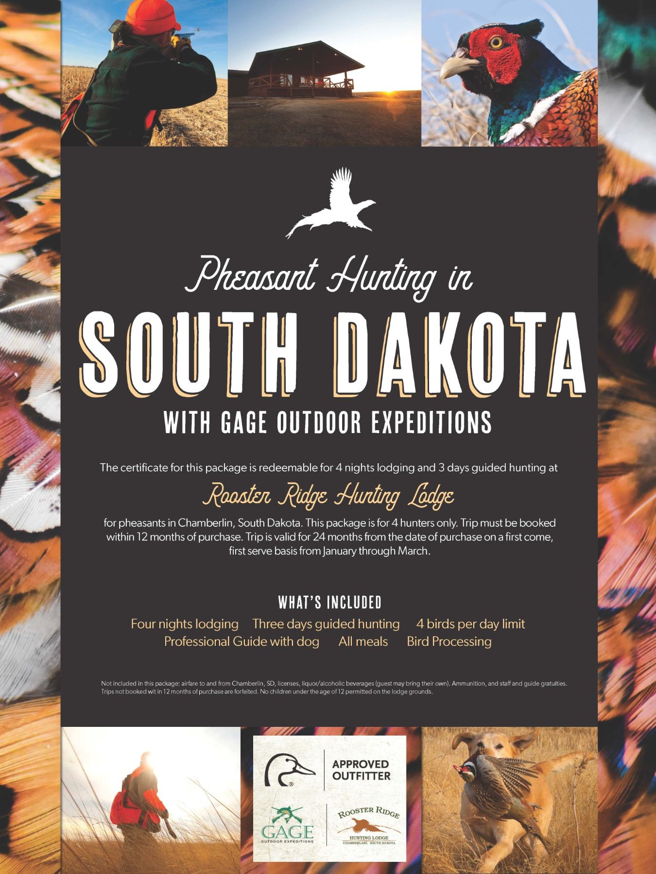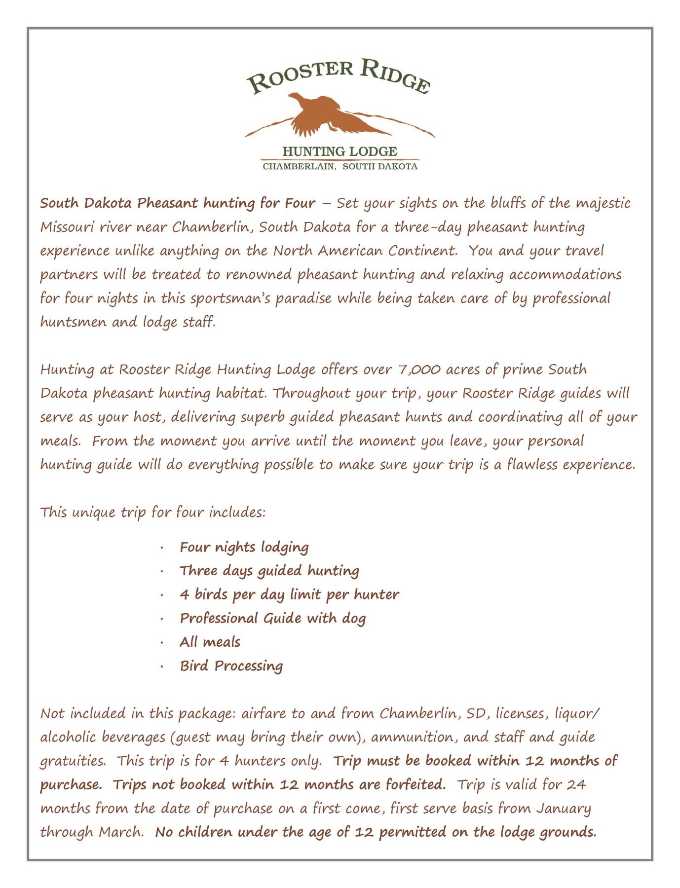 Set your sights on the bluffs of the majestic Missouri river near Chamberlin, South Dakota for a three-day pheasant hunting experience unlike anything on the North American Continent. You and your travel partners will be treated to renowned pheasant hunting and relaxing accommodations for four nights in this sportsman’s paradise while being taken care of by professional huntsmen and lodge staff. Hunting at Rooster Ridge Hunting Lodge offers over 7,000 acres of prime South Dakota pheasant hunting habitat. Throughout your trip, your Rooster Ridge guides will serve as your host, delivering superb guided pheasant hunts and coordinating all of your meals. From the moment you arrive until the moment you leave, your personal hunting guide will do everything possible to make sure your trip is a flawless experience. This unique trip for four includes: Four nights lodging, Three days guided hunting, 4 birds per day limit per hunter, Professional Guide with dog, All meals, Bird Processing. Not included in this package: airfare to and from Chamberlin, SD, licenses, liquor/ alcoholic beverages (guest may bring their own), ammunition, and staff and guide gratuities. This trip is for 4 hunters only. Trip must be booked within 12 months of purchase. Trips not booked within 12 months are forfeited. Trip is valid for 24 months from the date of purchase on a first come, first serve basis from January through March. No children under the age of 12 permitted on the lodge grounds.