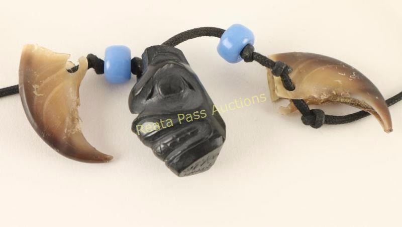 Tlingit carved natural black stone pendant and two bear claws, signed Jackson.