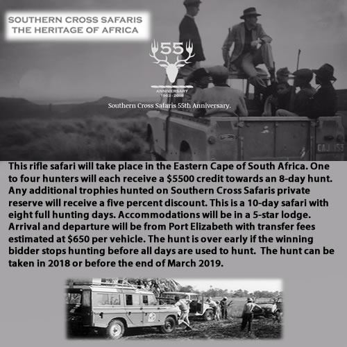 This rifle safari will take place in the Eastern Cape of South Africa. One to four hunters will each receive a $5500 credit towards an 8-day hunt. Any additional trophies hunted on Southern Cross Safaris private reserve will receive a five percent discount. This is a 10-day safari with eight full hunting days. Accommodations will be in a 5-star lodge. Arrival and departure will be from Port Elizabeth with transfer fees estimated at $650 per vehicle. The hunt is over early if the winning bidder stops hunting before all days are used to hunt. The hunt can be taken in 2018 or before the end of March 2019.