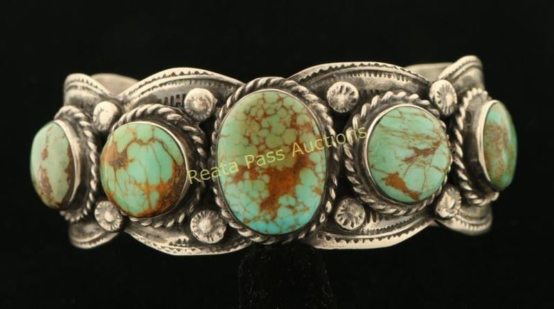 Features the quality & iconic look of old pawn jewelry seen in the 1960's &'70's. Genuine Nevada stones with a nice amount of matrix are bezel set on this Sterling bracelet. Rope, starburst spacers, hammered patterns and a satin buffing finish the design. Approximately 1" wide, this will fit a 6-1/2 to 7-1/2" wrist. This Southwest Turquoise Silver Cuff is a nice look for a guy or gal!