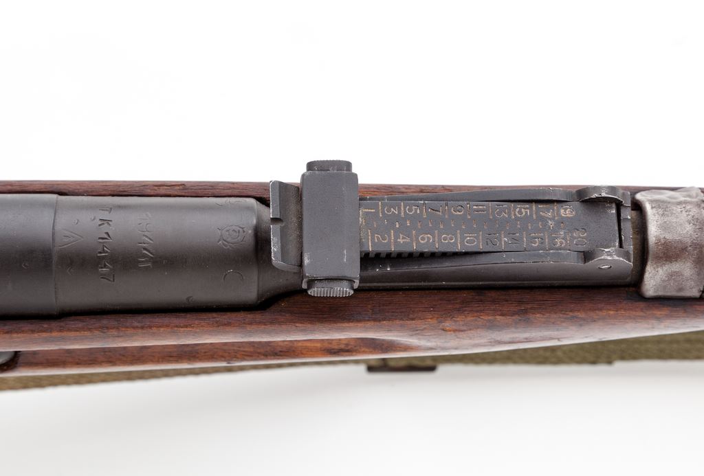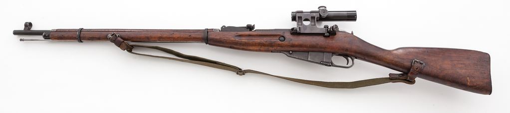 Soviet Model 91/30 Mosin Nagant Bolt Action Rifle, with Mount and PU Telescope, #B106563, 7.62x54R cal., 29'' barrel, matte blue finish, hardwood stock, hooded post front sight and adjustable leaf rear sight. Stamped on receiver ring with ''(Soviet crest)/1944r/(fletched arrow in triangle)''(symbol of the Izhevsk arsenal). Right side of buttstock shows several faint stamps. Fitted with cleaning rod, long turned-down bolt handle, and scope mount attached to left side of receiver. Rear handguard cap shows significant dents. (Ref. the book ''The Mosin-Nagant Rifle'', by Terrance W. Lapin, front cover.) Condition overall is very good, with refinished metal surfaces retaining over 90% finish showing thinning on muzzle and magazine. Handguard has two small cracks at the rear, and stock shows a pinned repair behind the front band, otherwise wood is very good with overall handling marks. Action is smooth, bore is dark with rust but may clean better. No visible import stamps. Scope mount appears unmarked; scope bracket is marked with small inspection stamps and shows an area of applied welding possibly to adjust tension. Scope tube is marked with A''(Soviet star/hammer/sickle)/half-moon symbol/91/30/No 5-72551''. Scope condition overall is very good with both knobs turning freely and the tube with only a few scratches. Painted rear lens area shows finish wear and light scratches. Scope optics are clear. Fitted with a non-standard green cotton sling. Est.: $750-$1,000. (C&R)(Joe Poyer collection)