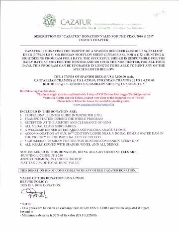 All sales are final and there will be no exchanges or refunds on hunts. SCI has made very effort to ensure the quality of donated hunts. However, SCI does not guarantee the satisfaction of the donor or the purchaser in any case. It is the purchaser’s responsibility to contact the hunt donor immediately and make all necessary arrangements for hunt dates and the application for any necessary paperwork for licenses and/or permits. Failure to make necessary arrangements may constitute forfeiture.