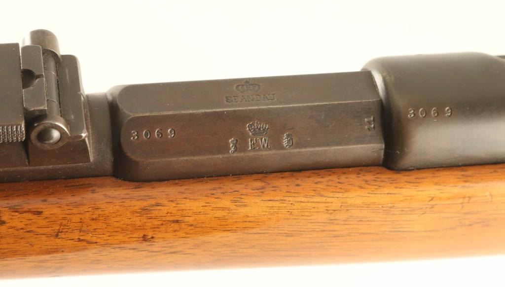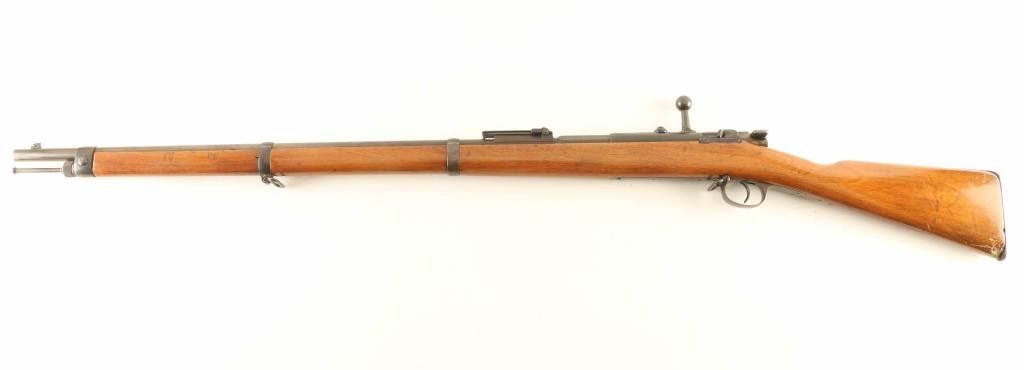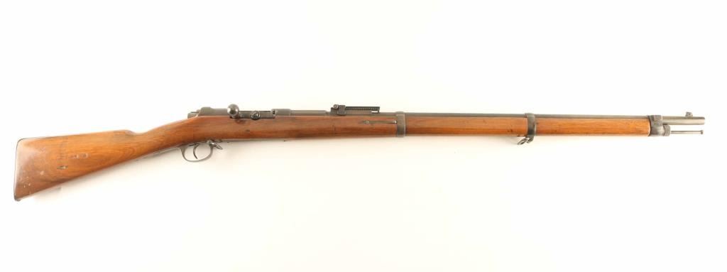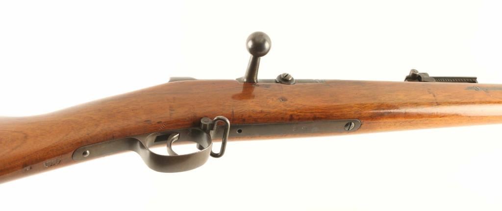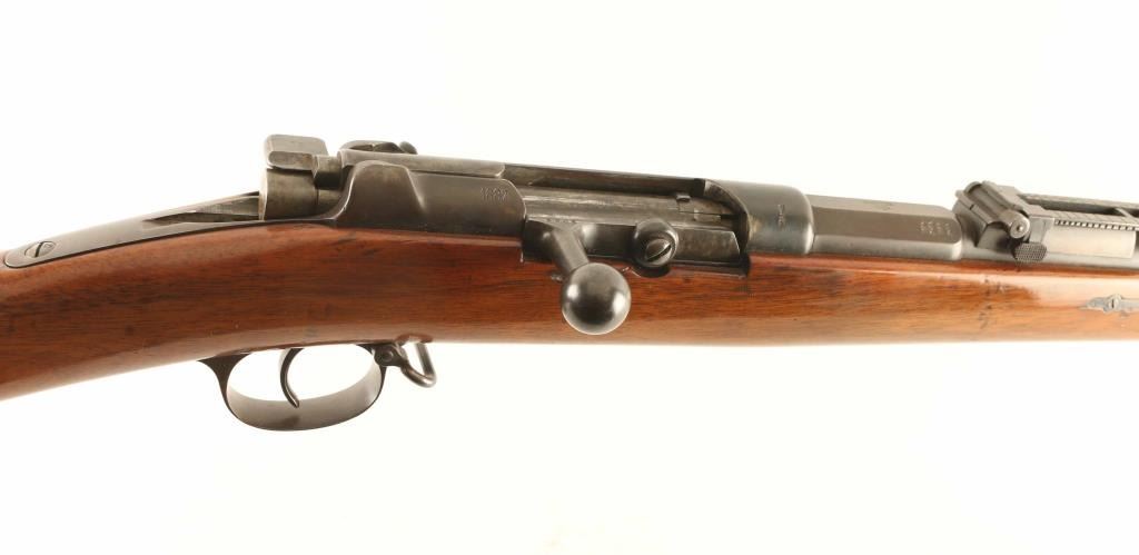 German military bolt action rifle dated 1887. Features blued finish, wood stock with straight grip, 31" barrel, full length tube magazine under barrel, bayonet lug, stacking hook, blade front sight, flip-up ladder type rear sight, straight bolt handle, magazine cutoff, manual safety, sling swivels. Bore is very good condition. Metal parts have full coverage medium brown colored finish, mottled with darker spots on barrel, bands, and bolt. Stock is fair to good condition, has urethane type finish, with dents and small areas of discoloration under the finish. Chunk of wood missing from toe under buttplate. Wood to metal fit is fair to good, indicates light sanding. Markings include crown over "SPANDAU", crown over "FW", "1.G.R.R. / 246" on buttplate. "3069" or "69" marked on most parts, no mismatched numbers observed. Condition is NRA Good+ *** Antique Firearm ***