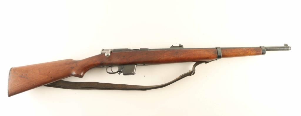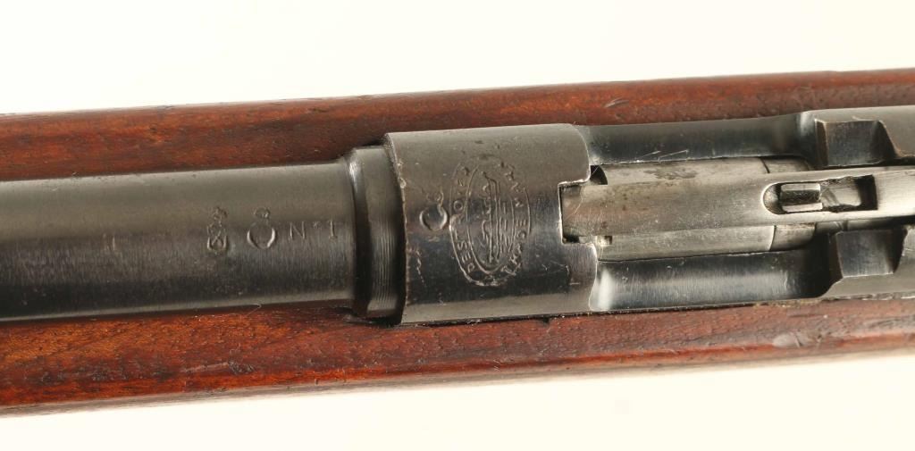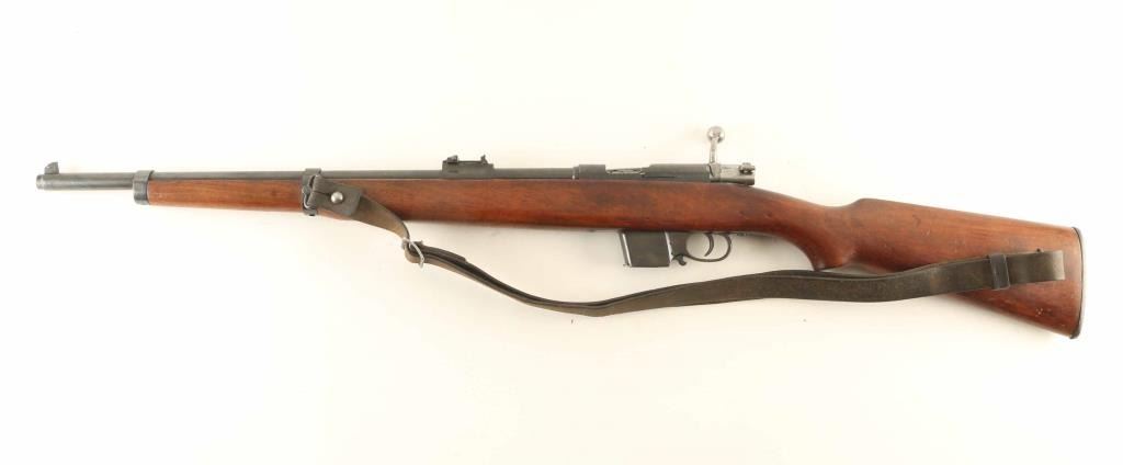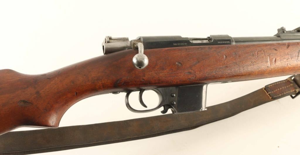 Spanish bolt action pistol caliber carbine imported by CAI, St Albans VT. Features blued finish, bolt assembly in the white, wood stock with pistol grip wrist, blade front sight, flip-up ladder type rear sight, manual safety, detachable magazine, side mounted sling swivels. Bore is very good condition. Retains 85% blued finish with scratches & scuff marks, bare metal at sharp edges. Wood is good condition with many scratches & dents, some gouges. Markings include "DESTROYER / TRADE MARK" on receiver ring forming an oval around the image of a naval vessel. Includes fair to good condition leather sling and one magazine. Condition is NRA Very Good *** C&R Firearm ***