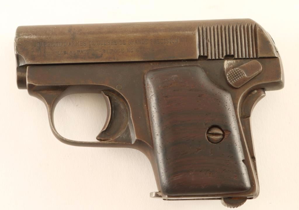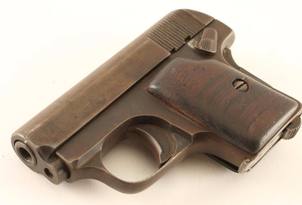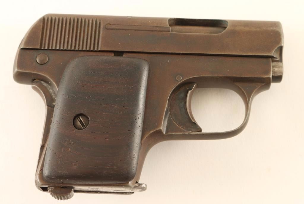 Spanish made copy of the 1906 Browning single action semi-automatic pocket pistol chambered in 6.35mm. Features a blued finish, 1.9" barrel, fixed sights, manual safety, grip safety, smooth trigger, 6 round magazine, and two-piece smooth wood grips. Pistol exhibits little remaining finish with the majority of the metal surfaces turned to a brown patina. Action does not appear to function properly, bore is dirty and wood grips are good. Condition is fair. ***C&R Firearm*** ***Modern Firearm***