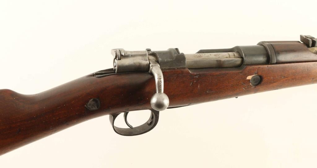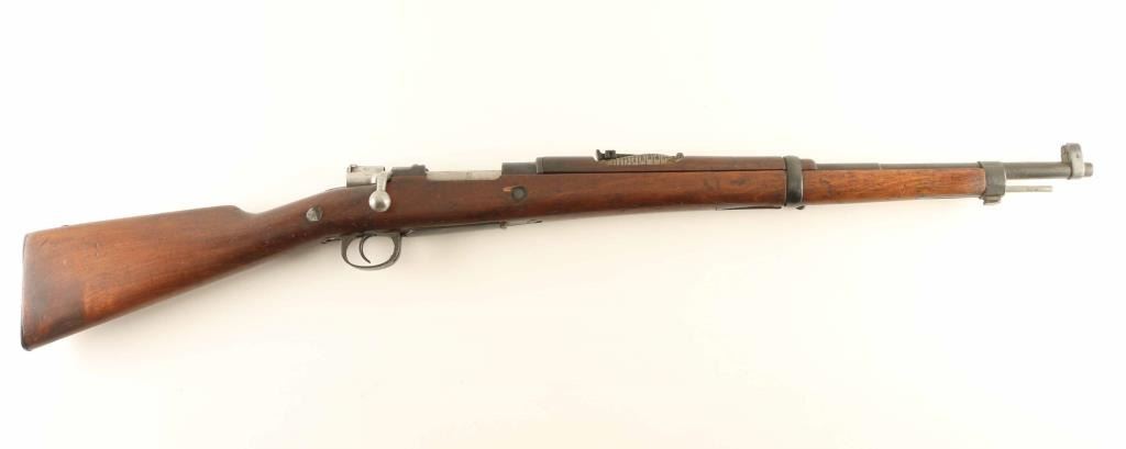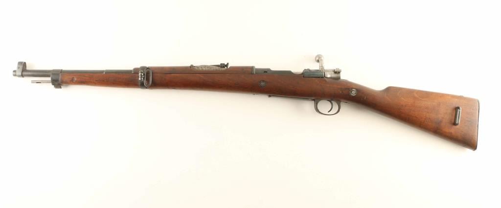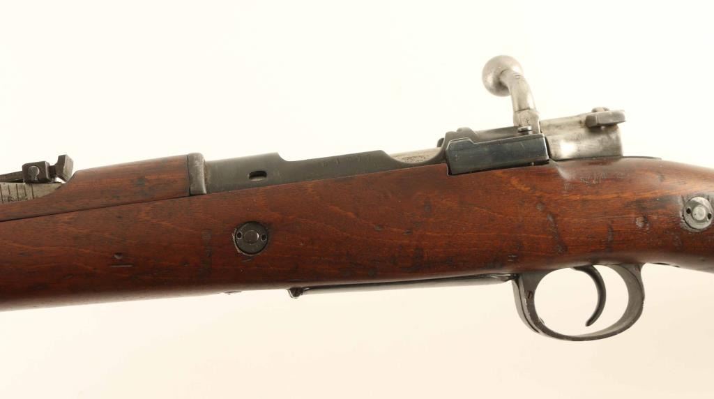 Spanish military bolt action rifle features blued finish, wood stock & handguard, straight grip, steel buttplate, 22" barrel, military type tangent sights, bayonet lug, cleaning rod under barrel, side mount sling swivels, manual safety. Bore is good condition, frosted with strong rifling. Retains 80% bluing, thinning or fading on high spots and sharp edges. Bolt is in the white, fair to good condition with evidence of cleaned patina. Wood is good condition, some dents & scratches, small flecks of white paint. No importer marks observed. Condition is NRA Good+ *** C&R Firearm ***