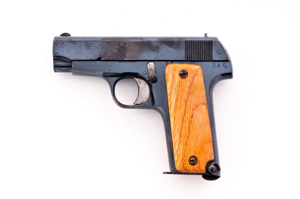 Spanish Royal Model 1914 Semi-Automatic Pistol, #3695, .32 cal., 3.5'' barrel, blue finish, smooth custom made oak grips, with one factory magazine. Condition is very good as refinished, retaining approx. 85% blue over some light corrosion. Serial number may have been re-stamped at a later date, as an additional number ''94574'' is present at rear portion of frame. Firing pin may need replacement. Grips, action and bore are good. Est.: $100-$200. (C&R/PPT)