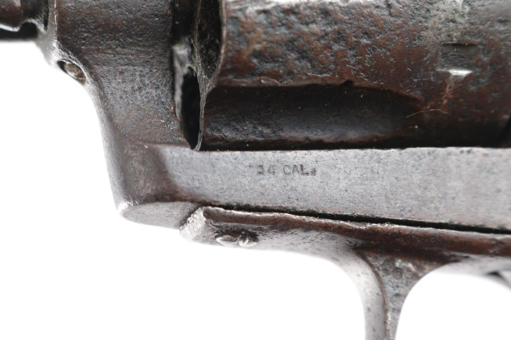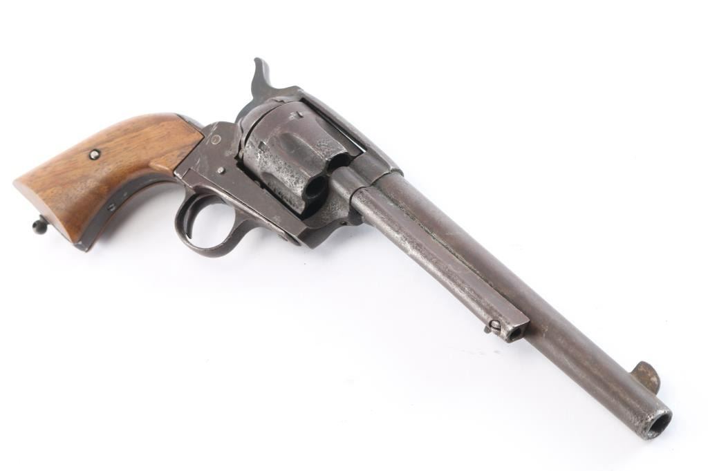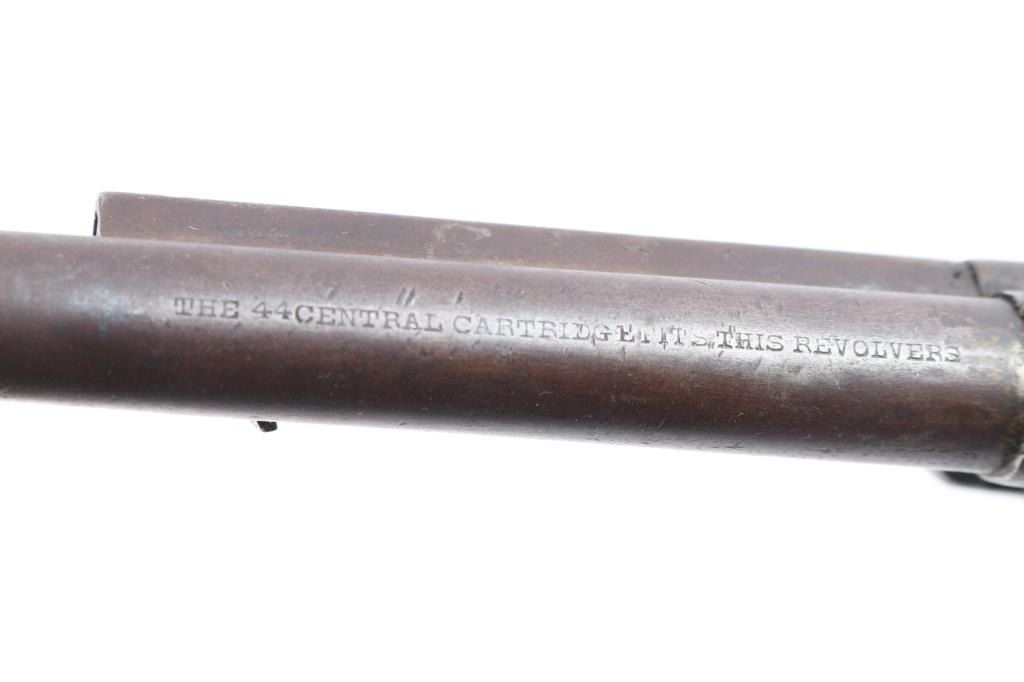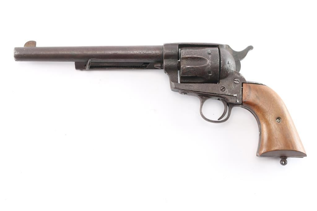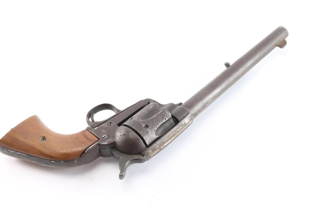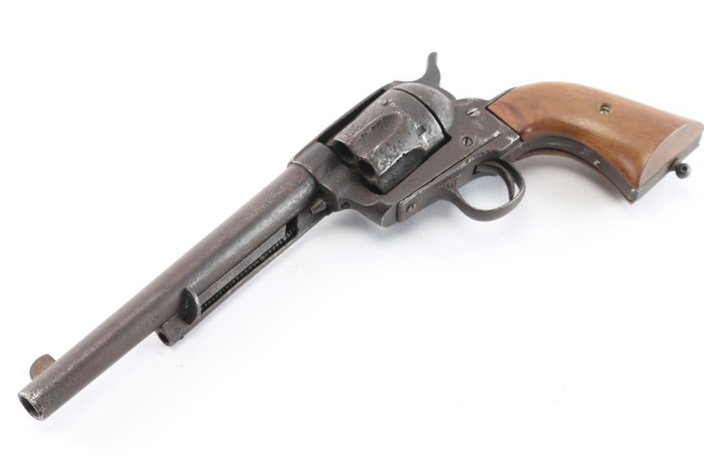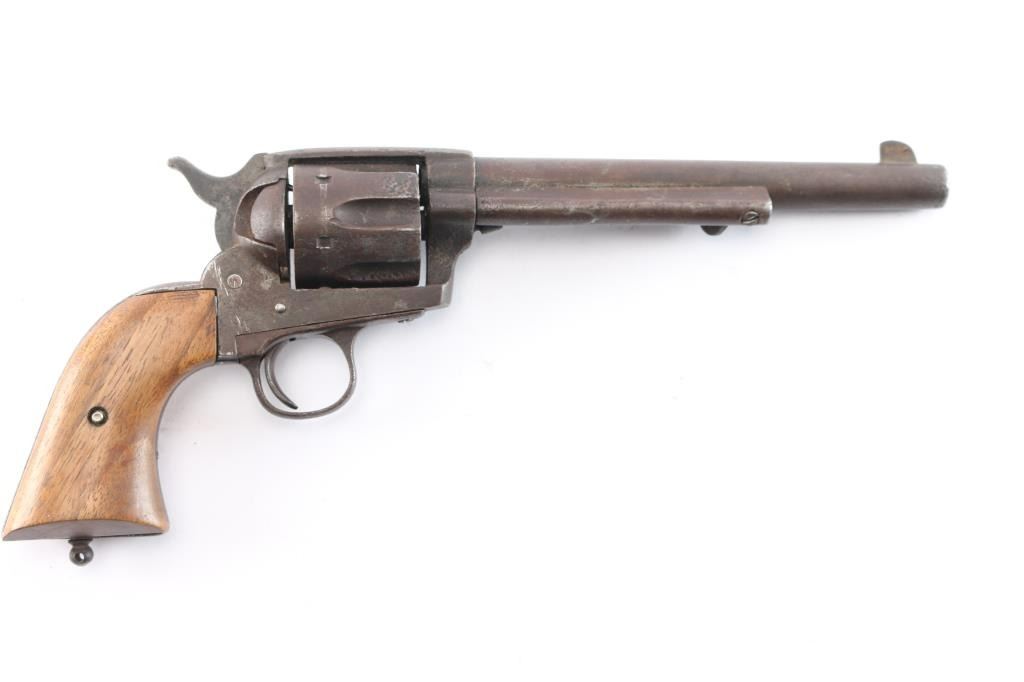 SPANISH COPY OF COLT SINGLE-ACTION REVOLVER circa. 1880-90 - No serial number. 7½" barrel in .44 centerfire cartridge. Top of the barrel stamped "The 44 Central Cartridge Fits This Revolvers." Left side of frame stamped ".44 cal.." Functioning action. Wood grips are newer replacements. Finish has turned a brown patina. Scattered pitting, mostly on the cylinder. Bore is rough/dark. Missing lanyard loop.