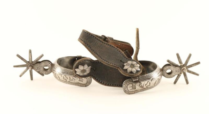Silver overlay with a geometric design. Large rowels with a floral motif leather button. Brown leather straps. Show use, age and wear.