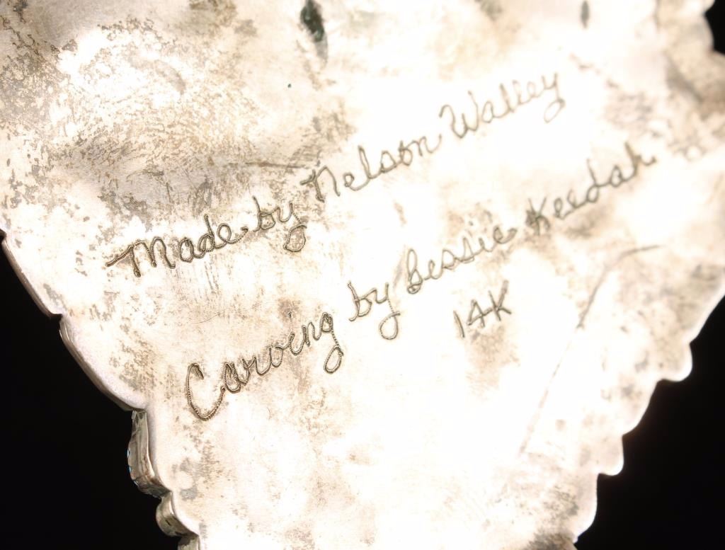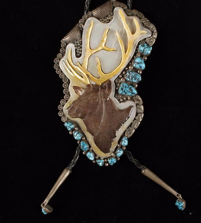 Hand carved elk design accented with turquoise nuggets made by Nelson Walley. Carving by Bessie Keedah. Sterling and turquoise tips. Very high quality design, great workmanship.