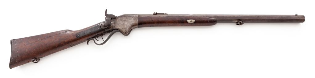 Spencer Cavalry Carbine Altered to Heavy Barrel Breechloading Buffalo-Style Sporting Rifle, #23235, approx. .48 RF cal., 26.25'' octagonal steel barrel, originally blue and case hardened metal finishes, dovetailed front sight missing its blade, adjustable leaf rear sight with vacant dovetail ahead. ''Spencer Repeating / Rifle Co., Boston, Mass.''over one-line patent date stamped atop receiver at breech. Double set triggers need adjustment. Walnut stocks; forearm retained by one iron wedge and two German silver oval escutcheons, two iron sling swivels, steel crescent buttplate with now-fixed trapdoor which originally opened to internal cartridge tube. Condition is fair to good having a smooth iron patina to metal mixed with some cleaned pitting. Wood shows use and age, losses to both sides at front of forearm; buttstock has lengthwise crack from comb to buttplate and another at left wrist, and is loose at junction with receiver. Action is tight and crisp. Bore appears clean with good rifling. Est.: $1,200-$1,800. (Antique)(Joe Poyer collection)