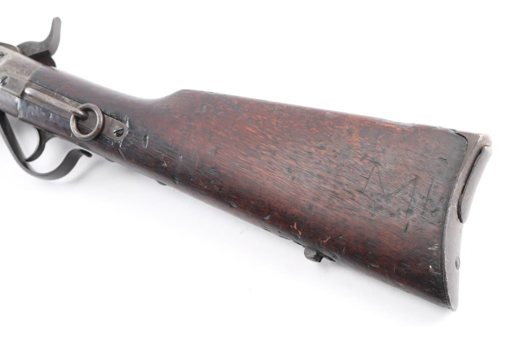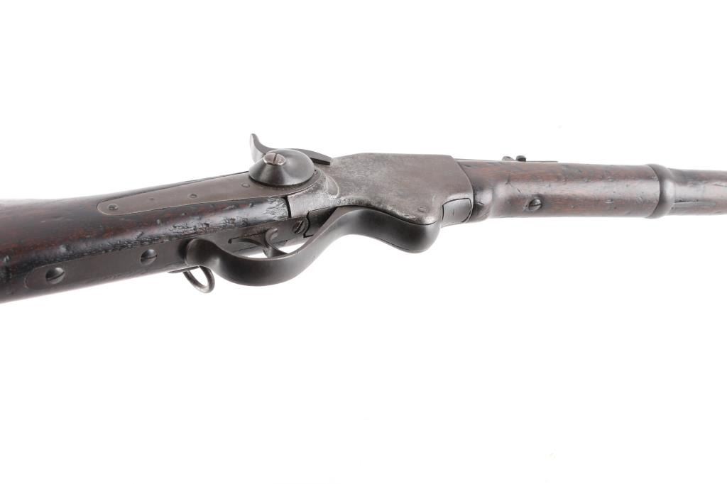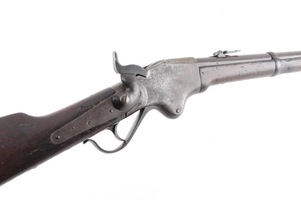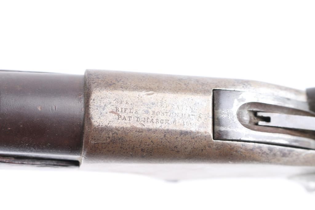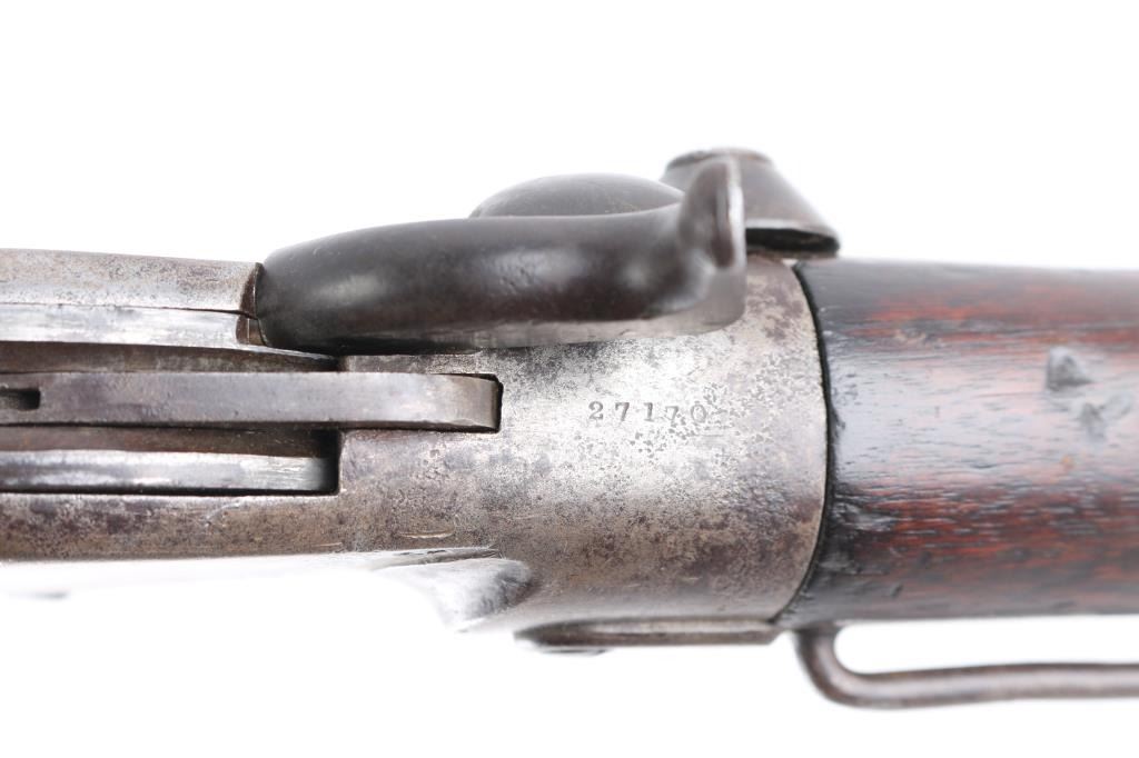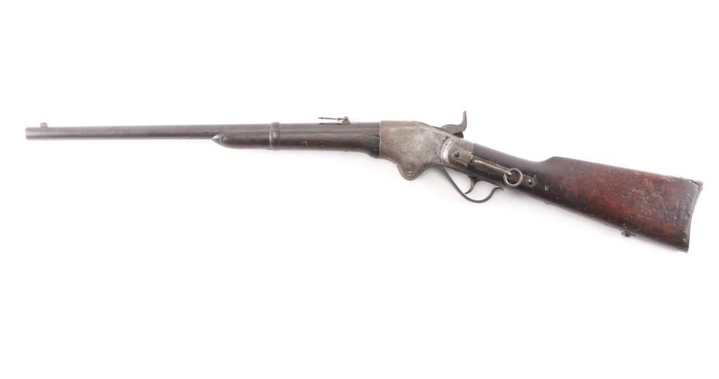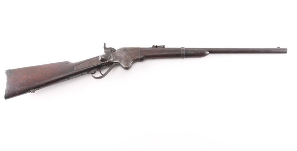 Antique Civil War era breech-loading lever action Saddle ring repeating rifle chambered in .56-56 Rimfire, manufactured circa 1863-1865. The Spencer was adapted by the Union Army during the American Civil War and was the worlds first military metallic cartridge repeating rifle. Features a blued 22" round barrel, front sight base but blade is flush with the base, flip-up ladder style rear sight graduated to 700 yards, rounded trigger, knurled hammer spur, 7 round tube magazine located in the buttstock, Stabler magazine cut-off, sling bar with saddle ring, J shaped finger lever, smooth walnut forend with single barrel band, and straight grip shoulder stock with metal carbine buttplate. The barrel shows an aged dark brown patina. The former case hardened receiver display a mottled light/dark grey patina with scatter light pitting. The lever/feeding operation seems to be in good working order, the two cock hammer & trigger mechanisms work well, the bore is fair to good, somewhat bright with good rifling, some scattered light pitting. The forward top of receiver marked "SPENCER REPEATING RIFLE CO BOSTON MASS, PAT’d MARCH 6, 1860" and the serial number is on the top rear receiver, markings are mostly readable. The wood stocks are sound with the usual dings and dents, there is a small sliver of wood missing from the rear top of the left side forearm, the rear sling swivel missing and the base screws appear to old replacements, no front swivel.Condition is NRA Fair to Good as Antique Firearm.