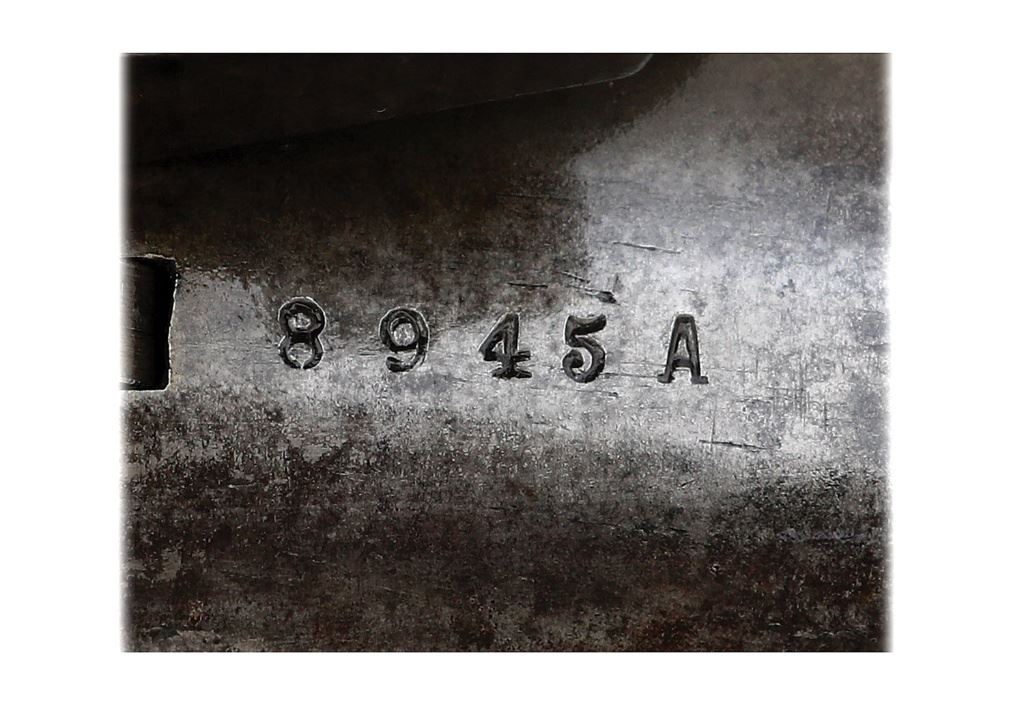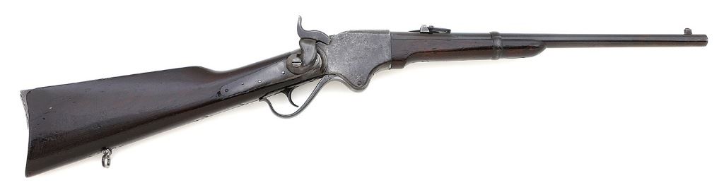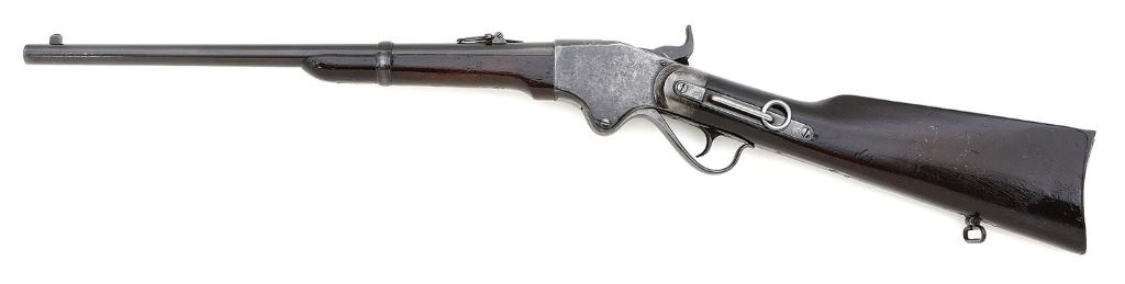 serial #8945A, 56 Spencer, 20'' three-groove barrel with a partially bright good bore showing some scattered areas of old oxidation and strong rifling throughout. This interesting example may be a commercial sale carbine or government reject as it has a peculiar ''A'' suffix after the serial number, there do not appear to be any inspector marks on the parts though a few of them do show scattered rather prominent punch marks. The metal surfaces have mostly toned to a mix of deep gray and gray-brown patina with some scattered old light pitting and handling marks. The inside protected areas of the breechblock retain a healthy amount of nice case-hardened colors and the arm is not equipped with the Stabler cutoff device. All markings remain intact and strong, the top chamber flat bearing the usual Model, patent and maker's information. The smooth walnut buttstock and forend remain in very good plus condition showing some older added finish that has darkened from the years with scattered light dings and handling marks. The sling swivels, ring and proper sights are intact, the barrel is matching the action though does not bear the ''A'' suffix and the action seems to function well mechanically. A very good example that is a little bit out of the ordinary for the antique arms collector. (13C11625-2) {ANTIQUE} (1200/1800)