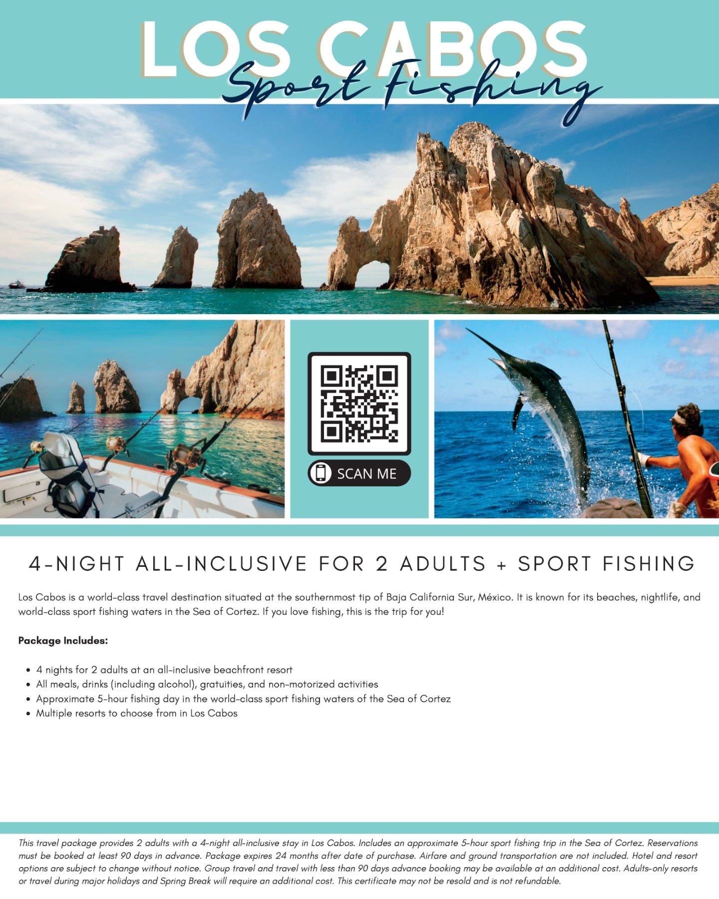 Los Cabos is a world-class travel destination situated at the southernmost tip of Baja California Sur, México. It is known for its beaches, nightlife, and world-class sport fishing waters in the Sea of Cortez. If you love fishing, this is the trip for you! Package Includes: 4 nights for 2 adults at an all-inclusive beachfront resort. All meals, drinks (including alcohol), gratuities, and non-motorized activities. Approximate 5-hour fishing day in the world-class sport fishing waters of the Sea of Cortez. Dozens of resorts to choose from in Los Cabos. Terms and Conditions: This travel package provides 2 adults with a 4-night all-inclusive stay in Los Cabos. Includes an approximate 5-hour sport fishing trip in the Sea of Cortez. Reservations must be booked at least 90 days in advance. Package expires 24 months after date of purchase. Airfare and ground transportation are not included. Hotel and resort options are subject to change without notice. Group travel and travel with less than 90 days advance booking may be available at an additional cost. Adults-only resorts or travel during major holidays and Spring Break will require an additional cost. This certificate may not be resold and is not refundable. HGAVacations.com Link: https://www.hgavacations.com/cabo-fishing.html
