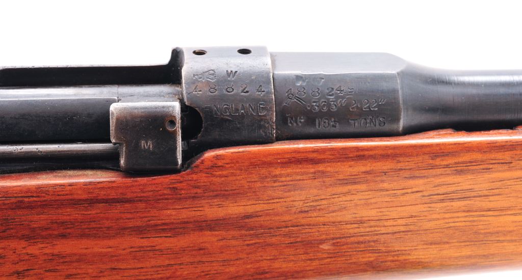 Sporterized British No. 1 Mk III Lee-Enfield Bolt Action Rifle, #W48824, .303 British cal., 25.2'' barrel, blued finish, hardwood stock, military blade front sight and adjustable leaf rear sight. Stamped on right side of action body ''(crown)G.R.1918 SHTL.E III*'', and on left rear ''S.S.A'' indicating mfg. by the Standard Small Arms Co. Export stamps on right side of barrel. Rifle has been sporterized by shortening the forend and removing the military hardware. Magazine is jammed in the magazine well. Condition overall is very good with over 95% of the reblued finish remaining on metal surfaces. Wood has been sanded and refinished to a high gloss which is thinning on the buttstock. Action is smooth, bore is very good. A broken fair condition leather sling is included. Est.: $150-$250. (Modern)