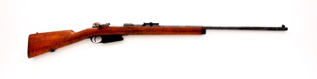 Sporterized Model 1891 Mauser Bolt Action Rifle, #A7842, 7.65x53mm cal., 29.13'' barrel, blued finish, hardwood stock, inverted ''V'' front sight with folding leaf rear sight. Argentine crest removed from receiver ring. Stamped on receiver rail ''MAUSER MODELO ARGENTINO 1891 MANUFACTURA LOEWE BERLIN''. Matching numbers on bolt; mismatched number on stock. Missing buttplate. Condition overall is very good with approx. 70% finish remaining on metal surfaces, showing some patina and covered with a now flaking applied varnish. Stock has been cut back and shows a few dents and scratches. Action is smooth, bore is very good with strong rifling. Est.: $200-$300. (Antique)