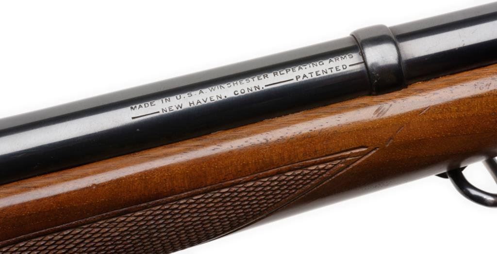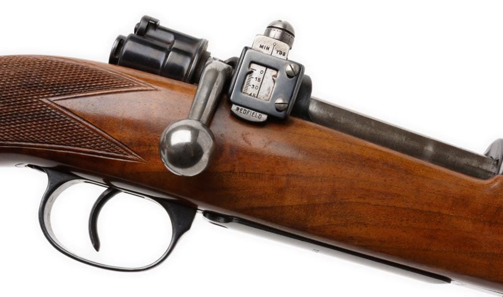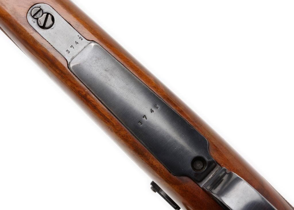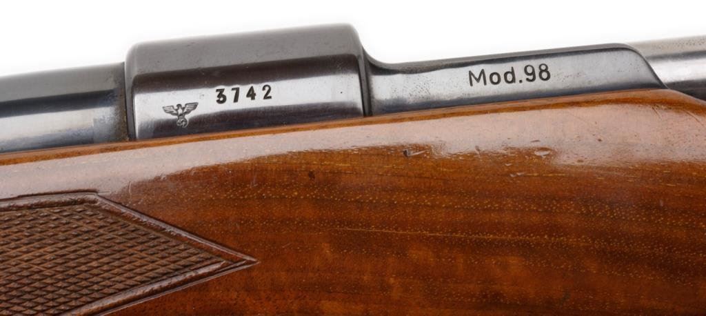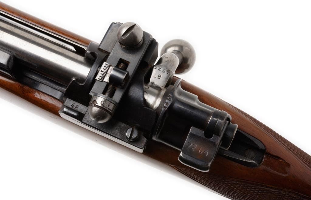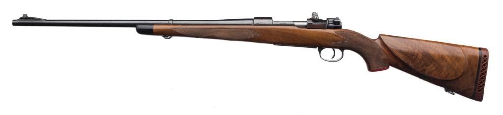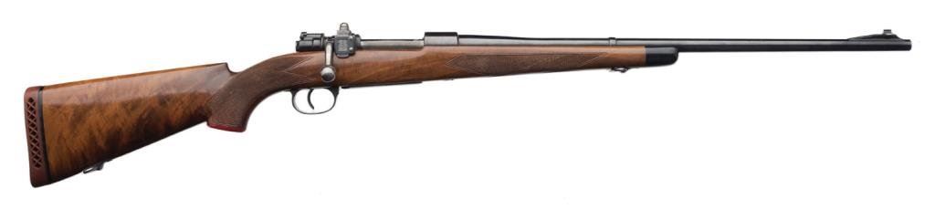 **Sporterized Model 98 Mauser bolt action rifle, 7.92 mm caliber, 23.5” round barrel, S/N 3742, re-blued finish, custom checkered deluxe wood stock; overall very good condition. Est.: $300-$600.