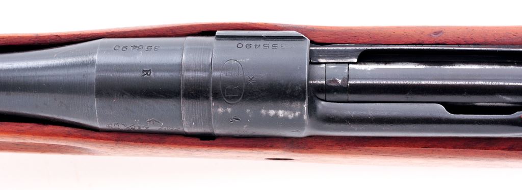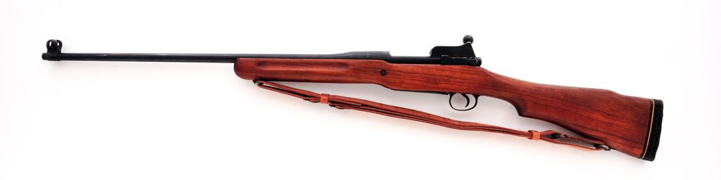 Sporterized Remington P-14 Bolt Action Rifle, #355490, .303 cal., 26'' barrel, blue finish, cutdown commercial stock, and added military butt pad, with modern leather sling. Mismatched bolt. Top of receiver ring marked ''RE''. Condition is excellent as modified with no metal having been cut. Approx. 92% blue remains. Stock is excellent as modified with alterations being well accomplished. Good action, bright bore. A very strong actioned sporterized rifle. Est.: $200-$350. (Modern)