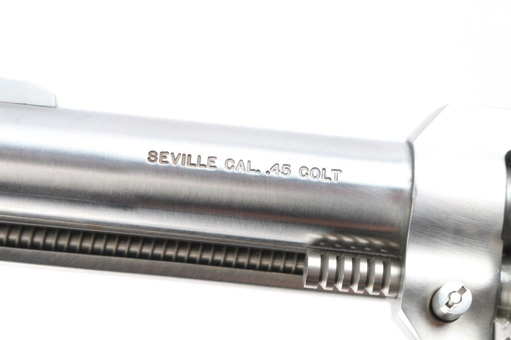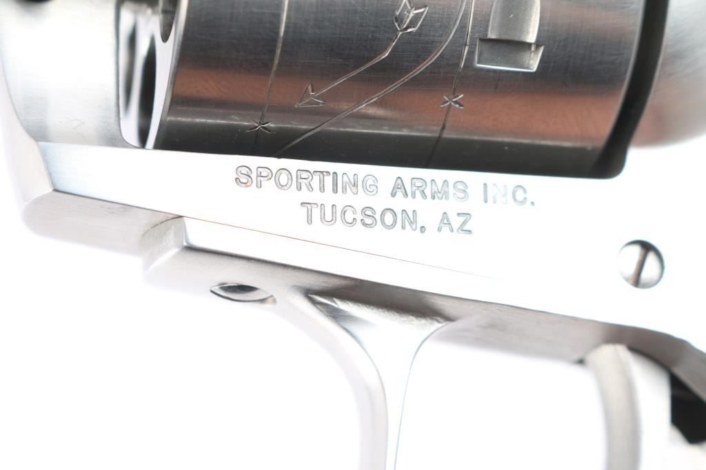 Single action six shot revolver chambered in .45 Colt. Copy of Ruger Blackhawk revolver made by Sporting Arms Inc. Tucson, AZ. Features stainless steel construction, a 4 5/8" barrel, engraved non-fluted cylinder, ramped serrated blade front sight with orange insert, adjustable rear sight, serrated wide hammer, serrated wide trigger and two piece over-sized stag grips. Smooth action with tight lockup. Bore is pristine. Retains approx. 99% finish with very few handling marks. Comes with original factory box. Condition is excellent. ***Modern Firearm***