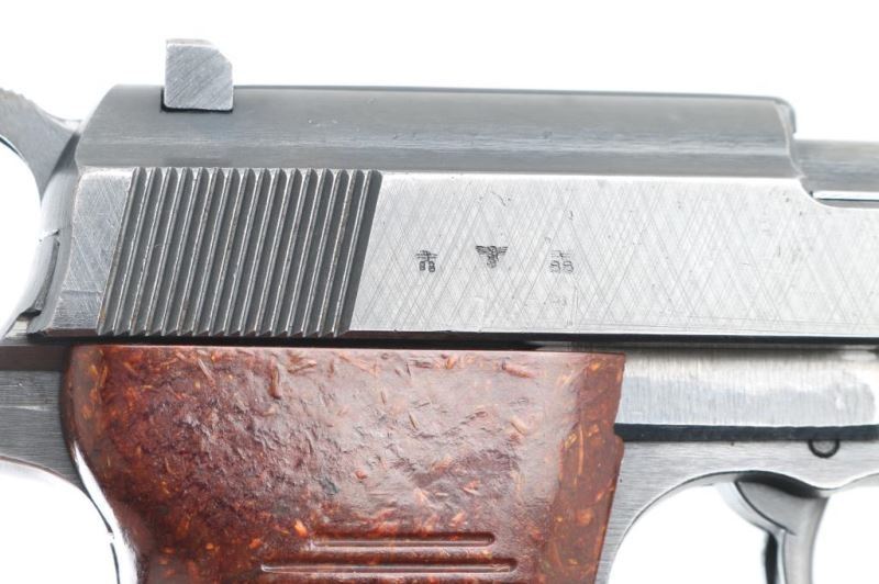 Pistol. Semi-Automatic. 8 rd Magazine. Third Reich era military issued sidearm. 4.9" barrel. Short recoil, hinged locking piece assisted breechblock. Produced from June 1942 to April 1945 at the Grottau, Czechoslovakia factory. Matching serial numbers including the locking block. Waffenamts. Bore is very good/bright with strong rifling. Bakelite grips very good. Blued finish is about 98%with some scratches. Original magazine stamped jvd. NRA Condition-Good. C&R firearm