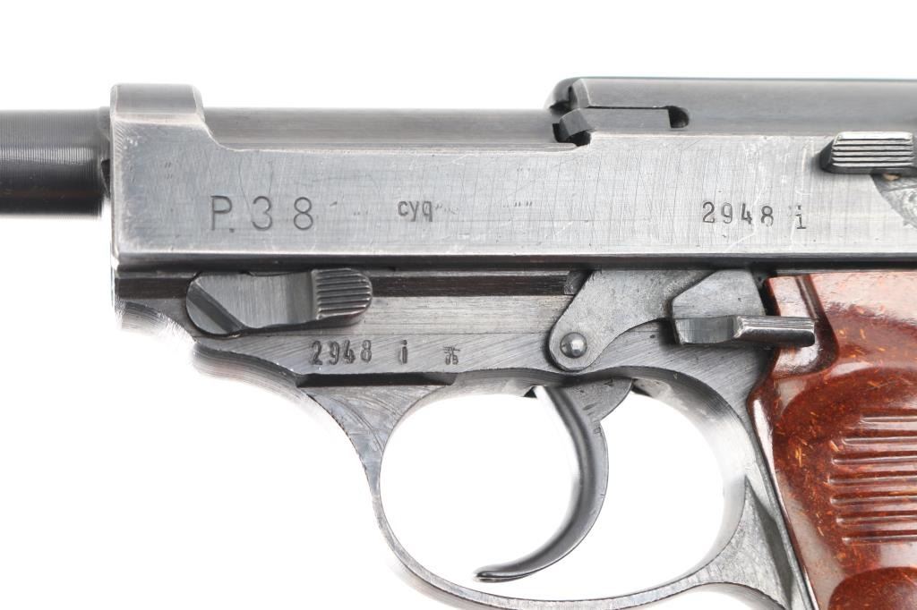 Semi-Automatic. 8 rd Magazine. Third Reich era military issued sidearm. 4.9" barrel. Short recoil, hinged locking piece assisted breechblock. Produced from June 1942 to April 1945 at the Grottau, Czechoslovakia factory. Matching serial numbers including the locking block. Correct Spreewerk waffenamts Eagle/88. Bore is excellent/bright with strong rifling. Bakelite grips very good. Blued finish is about 97% with some minor scratches/edge wear. Original magazine stamped "P.38" with waffenamt Eagle/135, issued with Mauser pistols from byf42 till byf43 c-block (late 42-March 1943) No import marks, bring-back. A nice one!NRA Condition-Very Good. C&R Firearm.