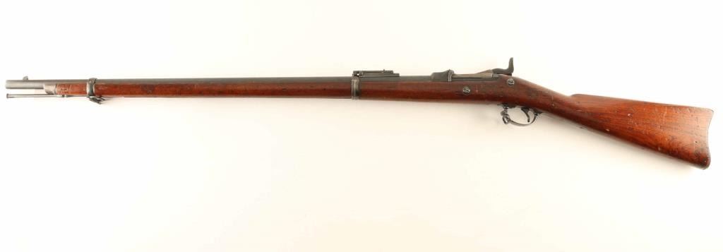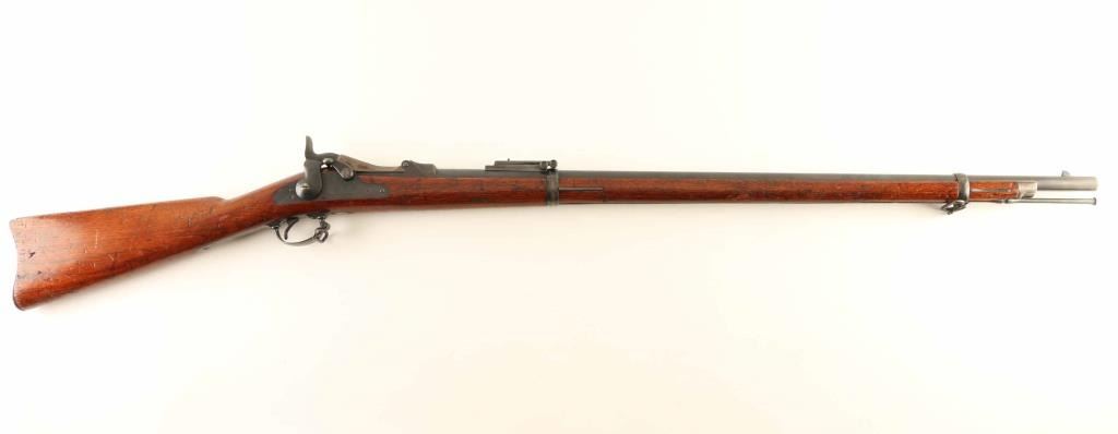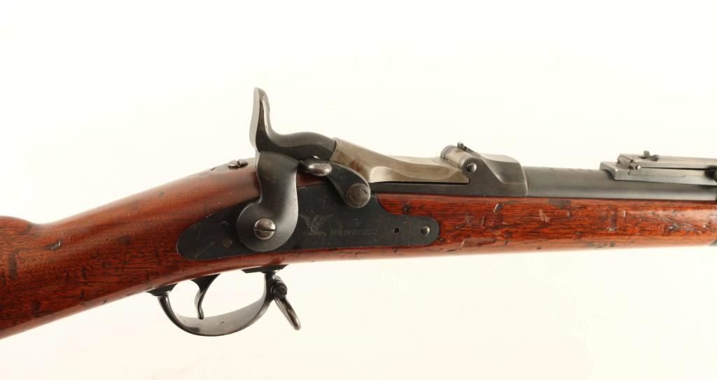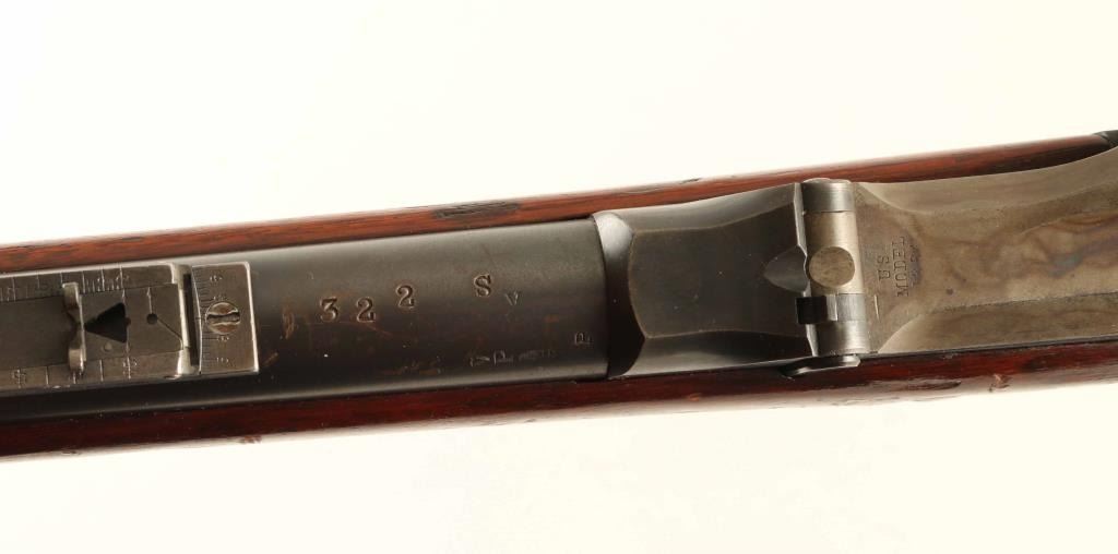 United States military single shot rifle features blued finish, full length wood stock, case color breech block & tang, 32" barrel, cleaning rod, sling swivels, stacking swivel, Buffington adjustable rear sight, blade front sight. Bore is very good or better condition. Retains 80% dark blue, with scuffs and discoloration on sides of barrel closer to muzzle, some light patina forming on triggerguard bow, bare metal from rubbing on sides of bands. Case color is bright and vivid, even underside of hinged breech. Markings are typically crisp and even, include: "US SPRINGFIELD" and eagle on lock plate, "322" , "S", "V" over "P" over eagle on barrel over chamber. Stock is good serviceable condition with numerous dents and shallow gouges, appears to have a light even varnish applied. Condition is NRA Fine *** Antique Firearm ***