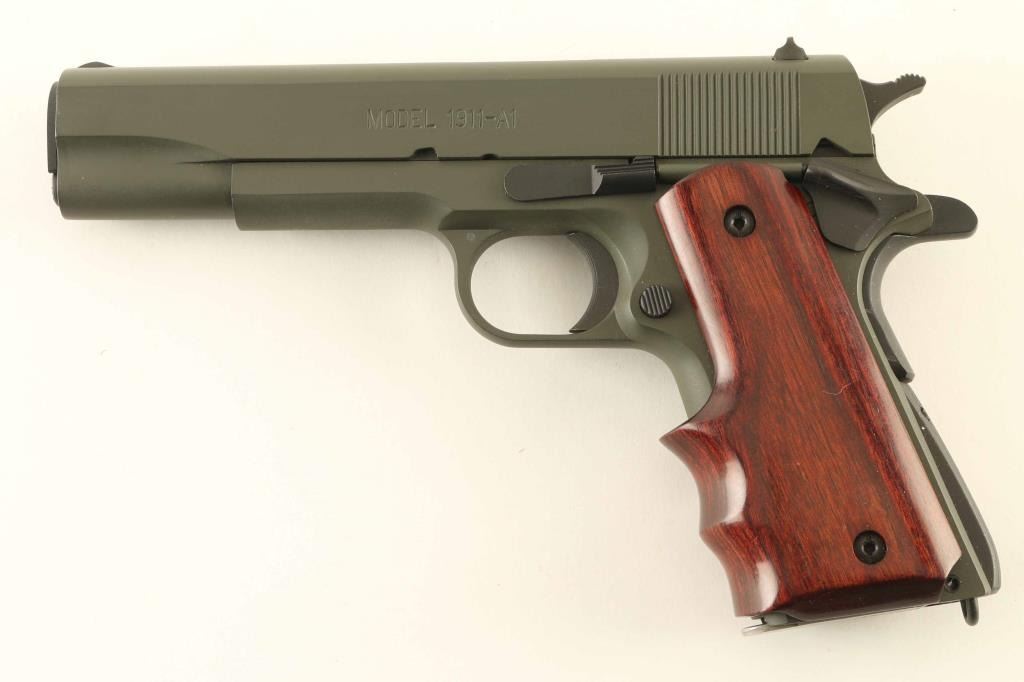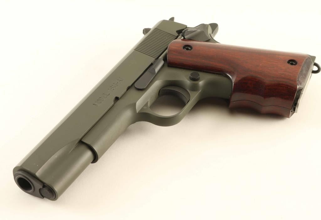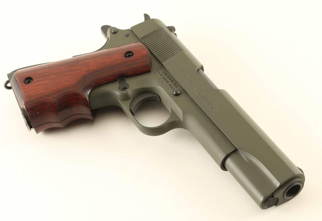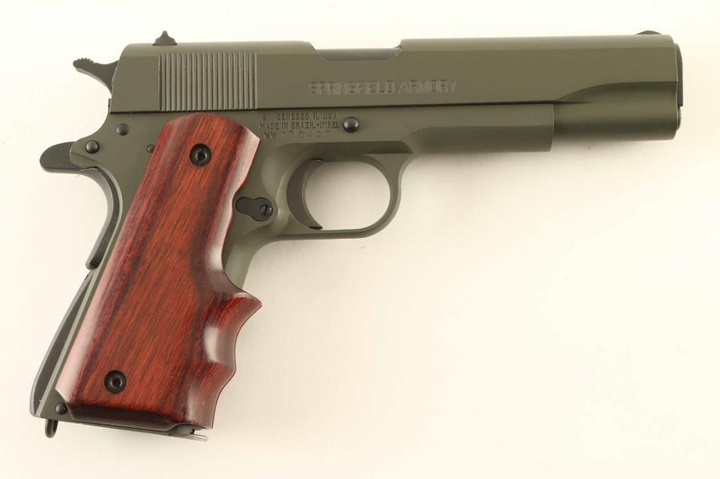 Semiautomatic pistol made in Brazil, imported by Springfield Armory, Geneseo IL. Features parkerized finish, wrap-around wood grips with finger grooves, 5" barrel, fixed sights, manual safety, grip safety, lanyard loop. Bore is very good or better condition. Overall condition is excellent with few signs of handling or use. Includes one magazine. Condition is NRA Excellent *** Modern Firearm ***