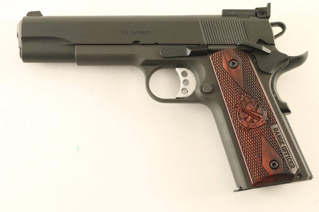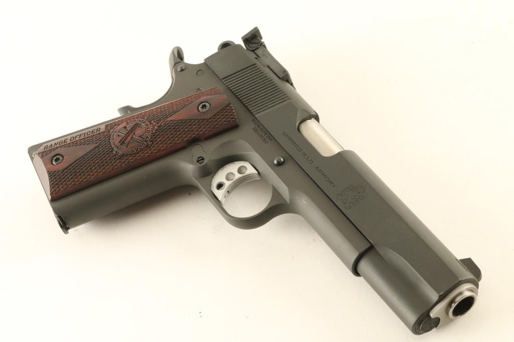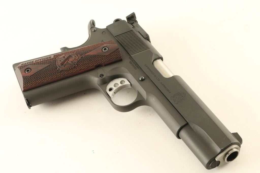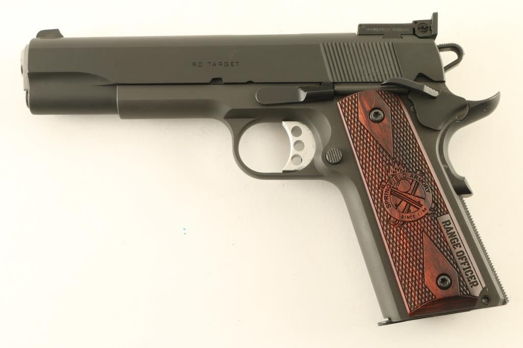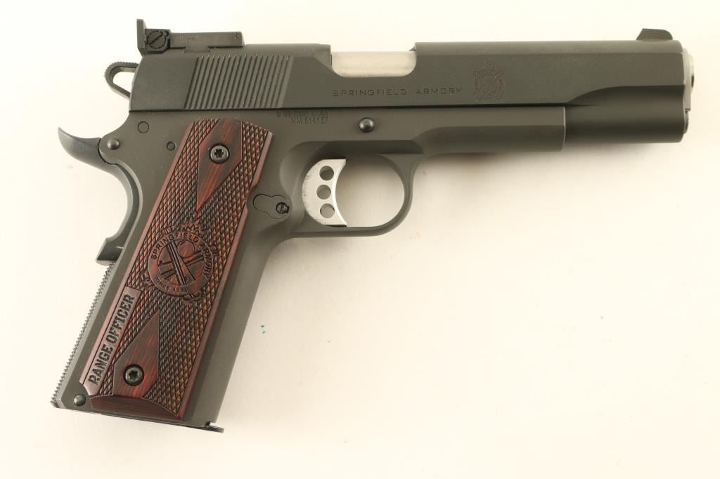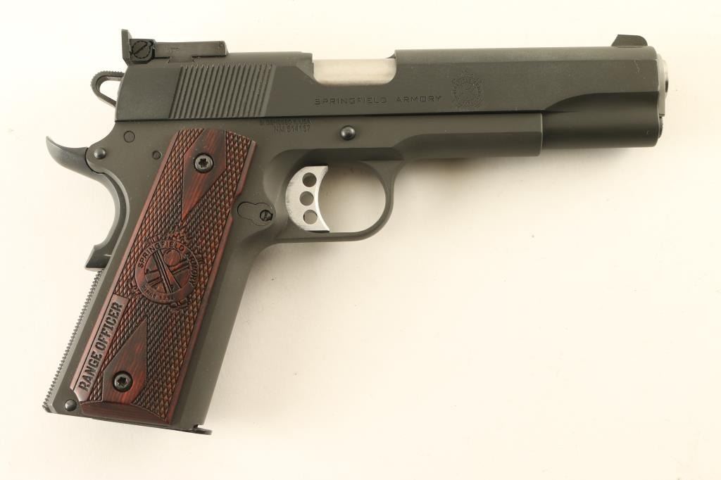 SN: NM614167 'RO (Range Officer) Target' 1911 type single action semi-automatic pistol. Features parkerized finish, 5" stainless steel barrel with loaded chamber viewing window, match grade stainless steel barrel bushing, dovetailed serrated black steel front sight with white painted accent, fully-adjustable serrated rear sight, serrated aluminum trigger adjustable for overtravel, skeletonized hammer with serrated spur, extended thumb safety on the left side of the frame, upswept beavertail grip safety with memory bump, push button magazine release, knurled flat mainspring housing, steel frame with beveled magazine well and checkered front strap, two-piece double diamond checkered cocobolo grips with Cross Cannon insignias. Condition is like new with few signs of handling. Includes the original factory hard case with documents, paddle holster, magazine pouch, (2) magazines. Condition is NRA Excellent - like new *** Modern Firearm ***