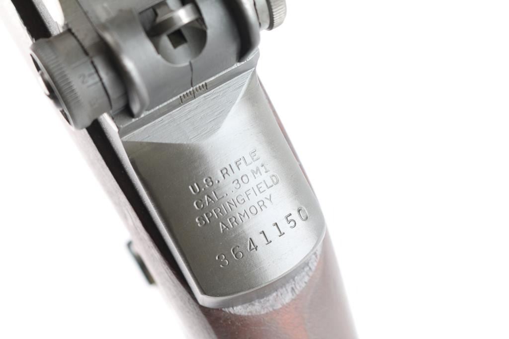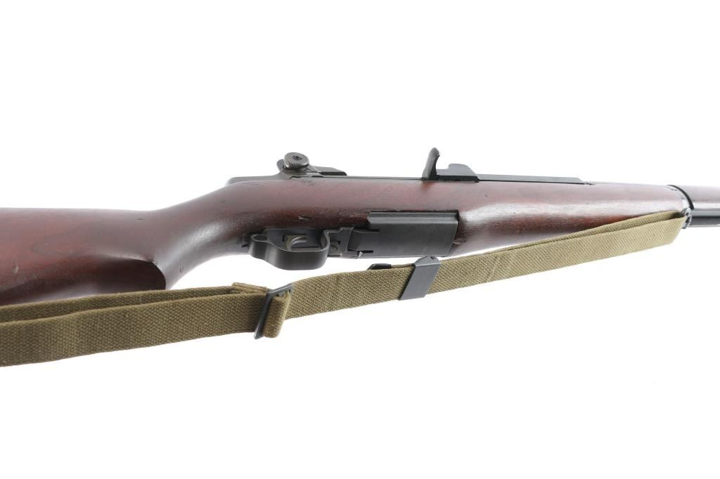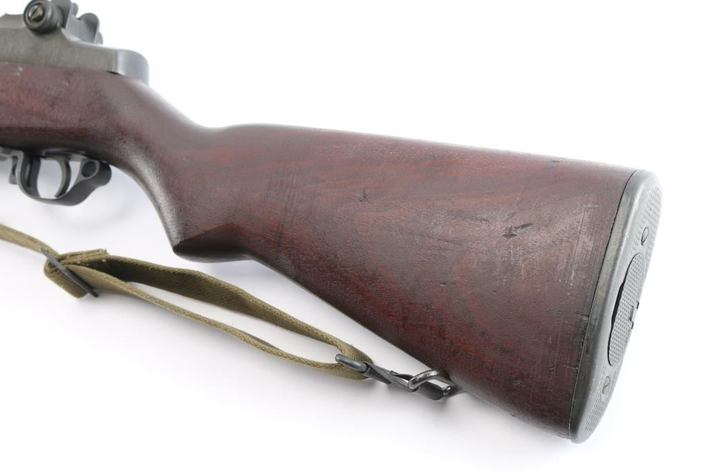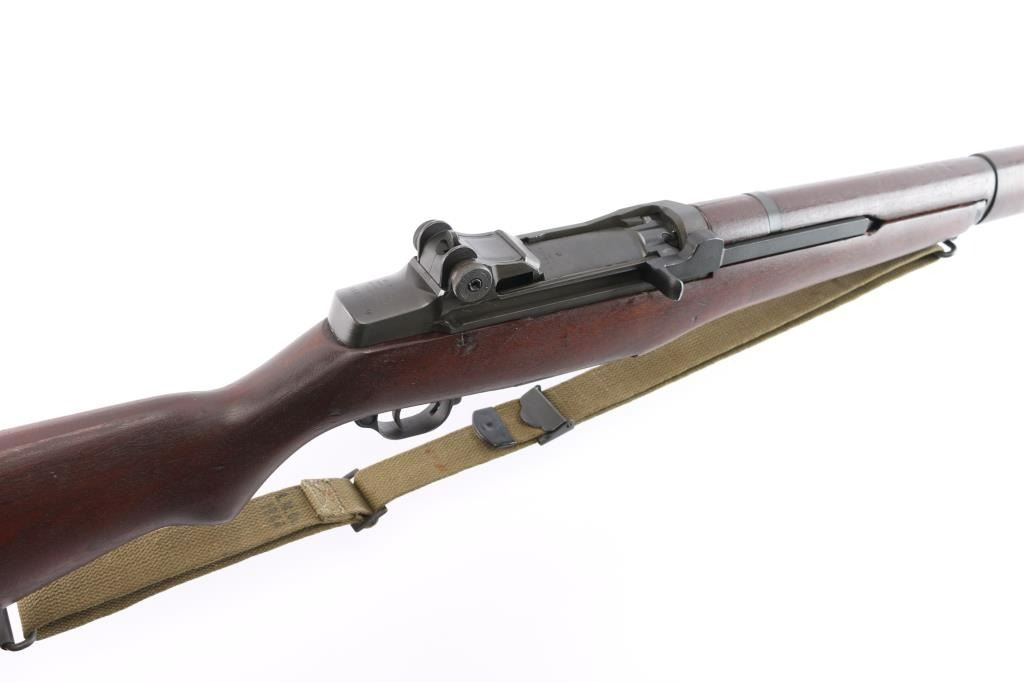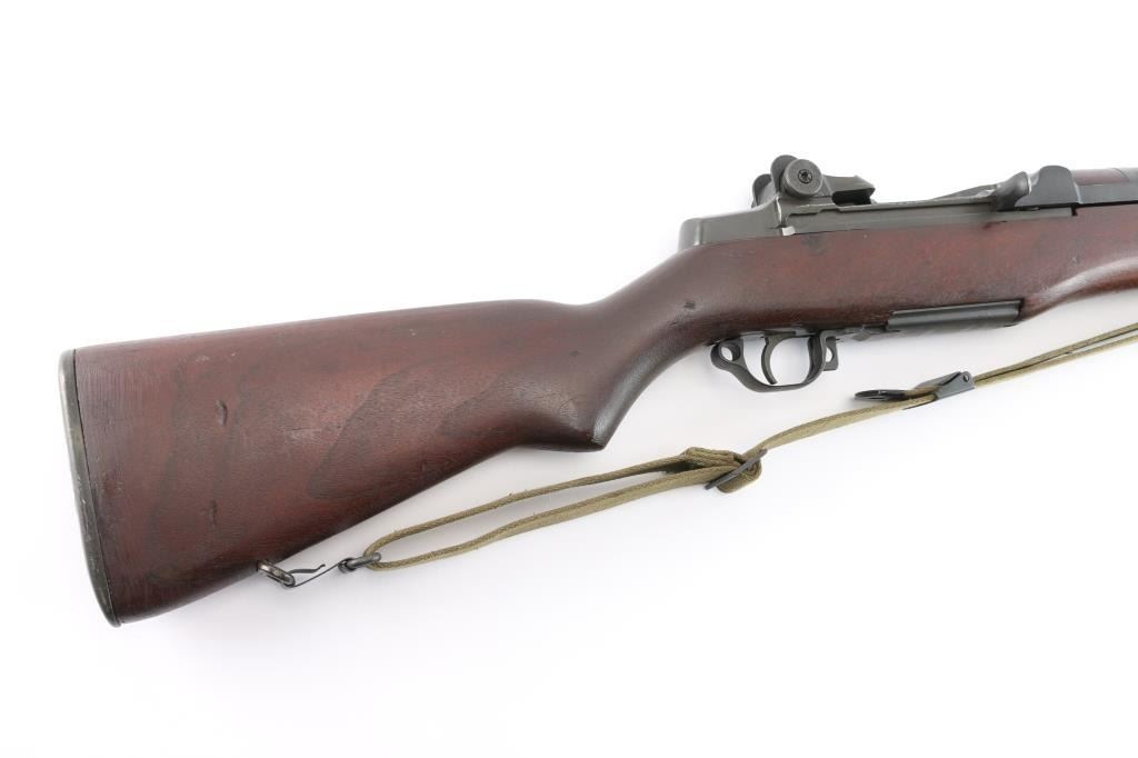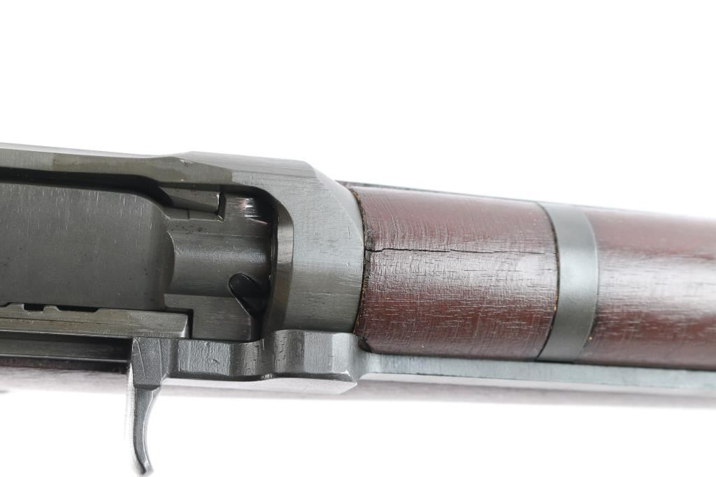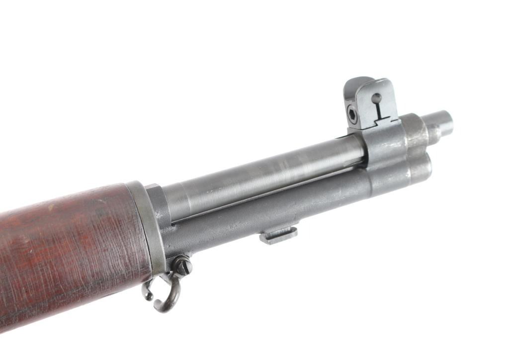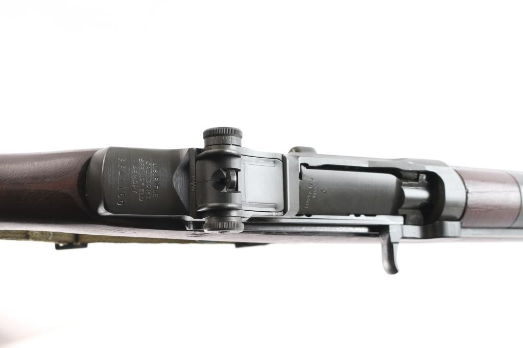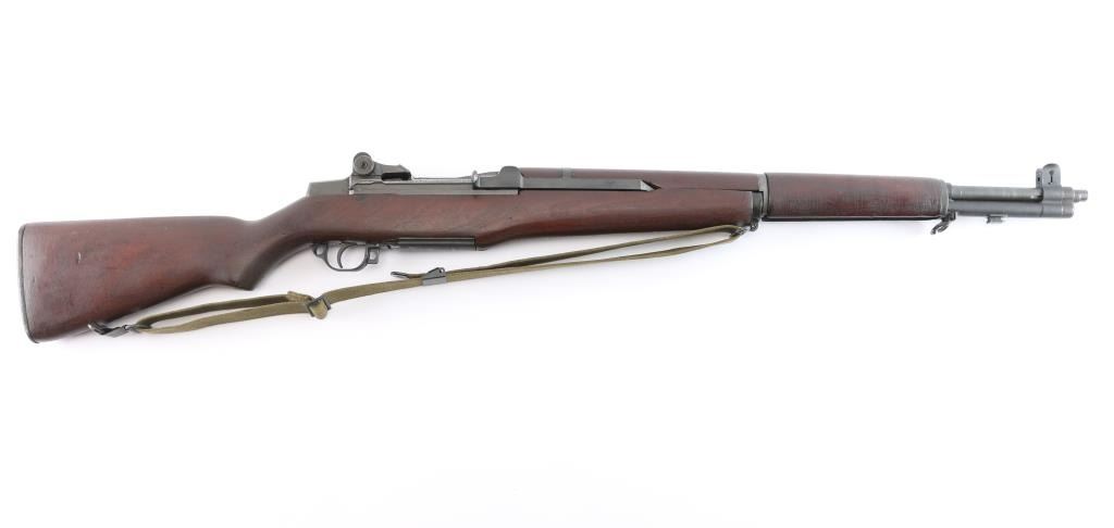 SA parts correct/matched date US military semiautomatic rifle. Serial number indicates manufactured March, 1945. SA barrel dated 3-45, D28290-12-SA on the side of the trigger group. hammer marked B46008-2 SA, Safety marked C48015-6 SA, op rod marked D35382 S SA, receiver marked O 85 A and D 28291 35 and the bolt is marked D28287-12 SA W10B. Arsenal reworked. Features parkerized finish, wood stock & hand guards, 24" barrel, adjustable sights with protected front blade & protected rear peep marked "BME" (Bruce Machine and engineering), fixed magazine for en-bloc clip, manual safety Handguard and froe stock a darker than the shoulder stock , "P" proof on the bottom of the grip. Bore is very good/bright, strong rifling. Metal parts retain about 95% parkerized finish. Shows edge losses & handling marks. Wood is good/sound with the usual minor scratches/dings and a 2" hairline crack in the top of the handguard near the receiver. Correct USGI green web sling attached. A correct SA matched late WW2 rifle. Comes with the Director of Civilian Marksmanship (DCM) Anniston Army Depot receipt.