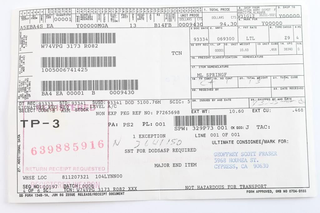 14.Class III designated firearms must be registered in compliance with the NFA registry. A $200 dollar federal tax payment is required each time a functional NFA firearm or suppressor to or from us. The fee as well as the payment is due at the time of purchase in order to process paperwork. The new owner will be required to complete 3 forms; (1) ATF Form 4, (2) fingerprint card , (3) ATF form 533.20 certificate of compliance. These forms will be provided to you by the auction house. The Chief law enforcement of purchasers municipality signature is required on a form 4. If state of local law requires a permit or license to purchase that also must go with the application. The buyer than mails the paperwork into the ATF. The auction house will then receive one copy of the form 4 back with the tax stamp attached to it. This is then given to the new owner when he or she picks it up. The following states do not allow individuals to own machine guns California, Hawaii, Illinois, Iowa, New Jersey, Kansas, Maine, Michigan, New York, and Rhode Island. Also all funds will be kept by the auction house until the final approval has been received.