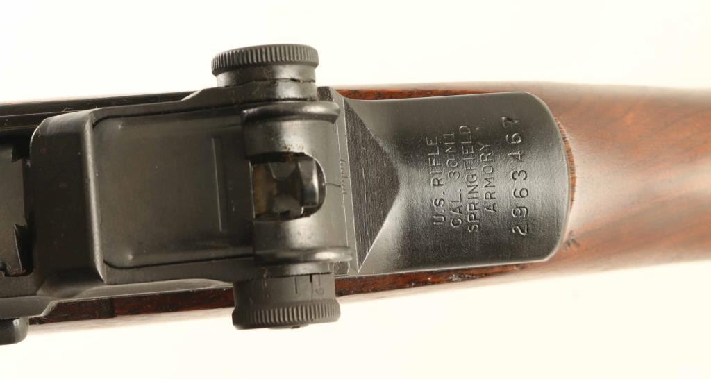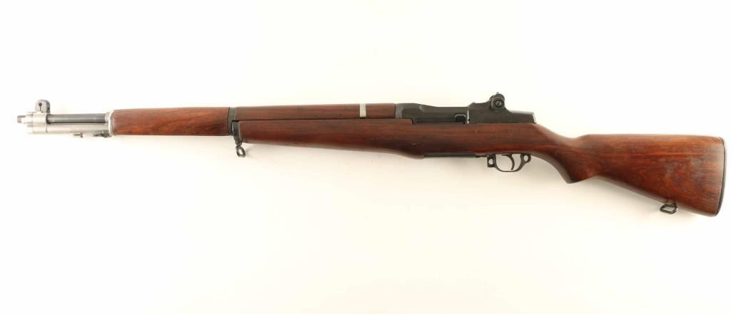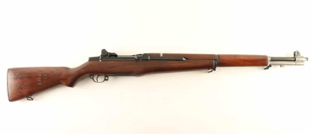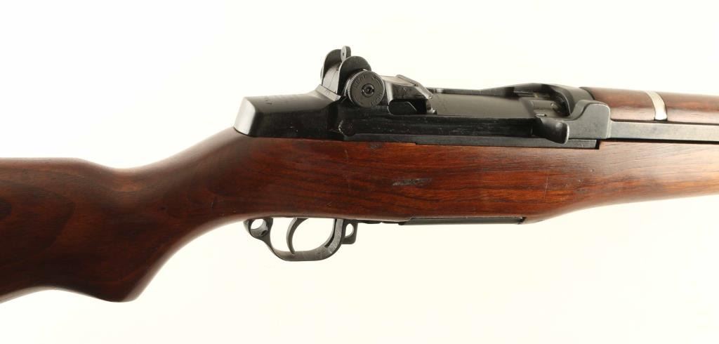 'Lend Lease' Arsenal rebuilt US military semiautomatic rifle bears London nitro proof. Features parkerized finish, wood stock & hand guards, 24" barrel, adjustable sights with protected front blade & protected rear peep, fixed magazine for en-bloc clip, manual safety. Bore is very good or better condition. Metal parts retain 90% dark gray color finish, with several parts showing mostly bare metal (rear handguard retaining clip, gas cylinder, gas cylinder lock). Wood is very good to excellent condition, some small dents, a 1" long gouge on right side below rear sight, butt stamped "AA / 16608". No importer marks observed. Top of barrel stamped with London nitro proof mark, "30-06 2.49" 18 TONS". Condition is NRA Very Good++ (as reworked) *** C&R Firearm ***