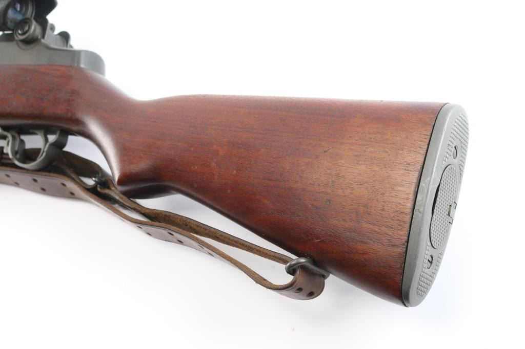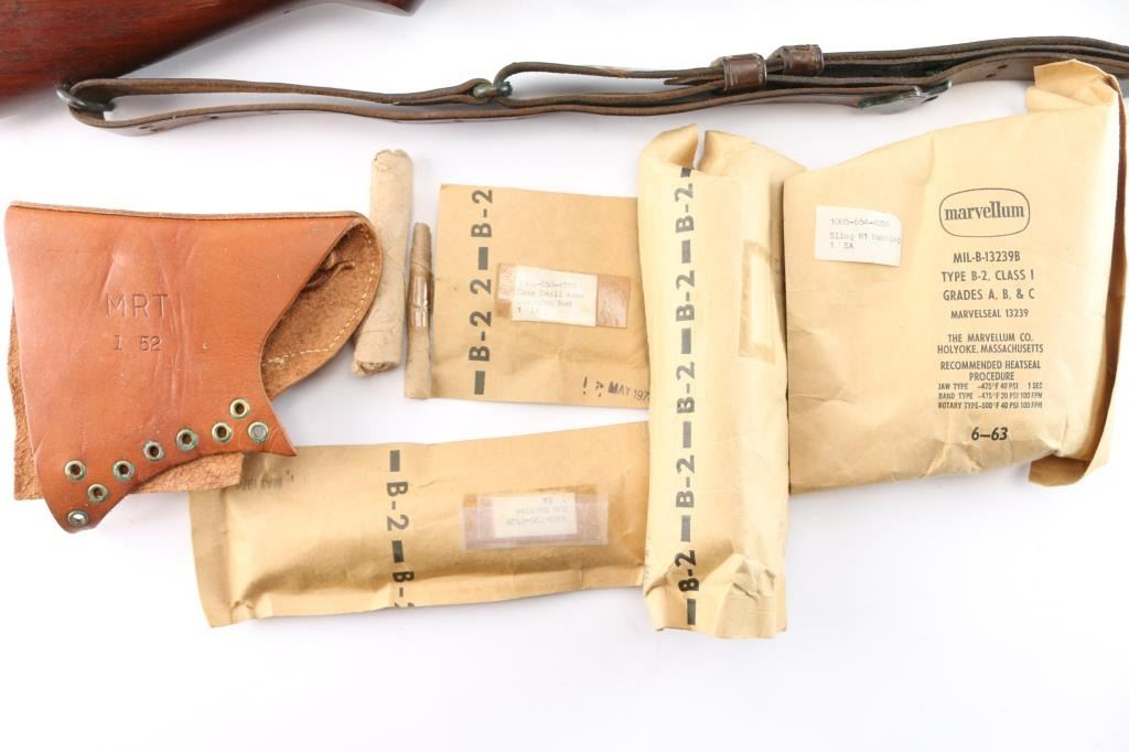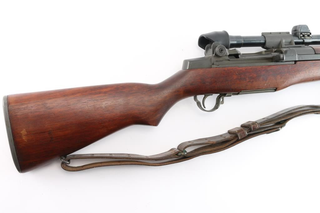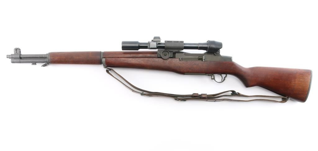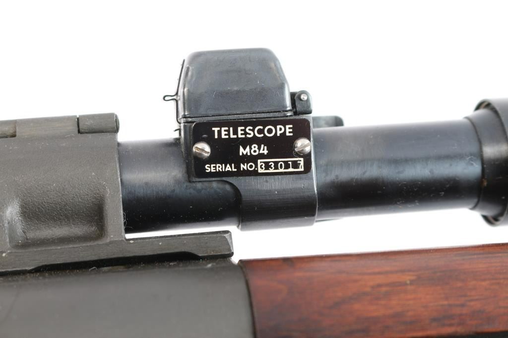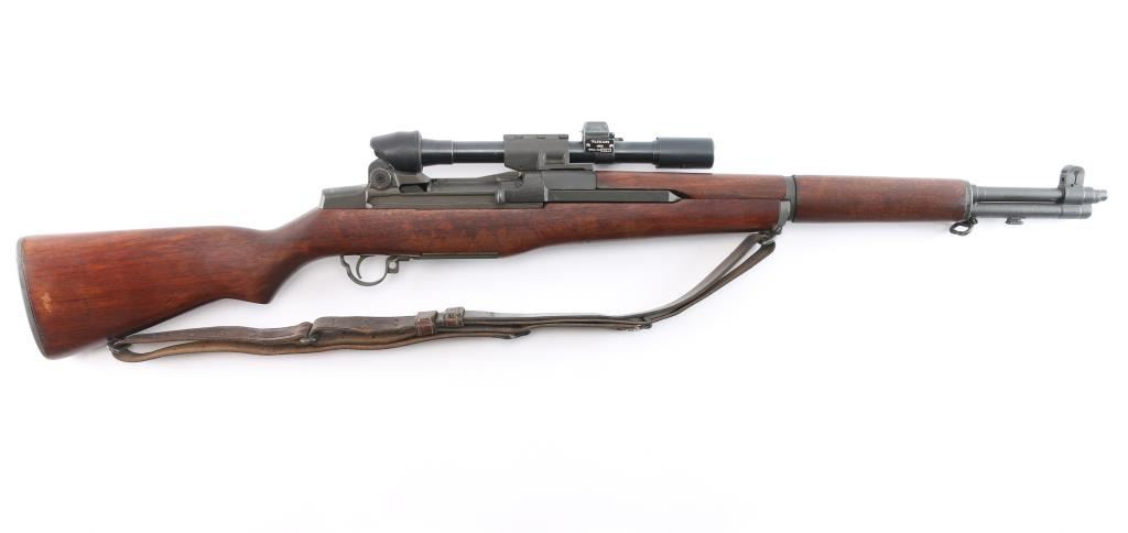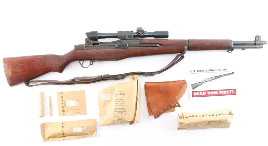 'Sniper-D' Rebuilt WWII era U.S. military clip-fed semi-automatic service rifle chambered in .30-06 Springfield, serial number dates to August, 1943. CMP rifle. Features a parkerized finish, 24" barrel marked "S-A 6-62" with large "T" & "U", blade front sight with flared protective ears, adjustable rear aperture sight marked "DRC", M84 fixed power scope with telescoping sun shade & rubber eye-piece, post-and-crosshair reticle. with correct M1D mount, smooth trigger, stamped trigger guard, bayonet lug, M1907 leather sling, stacking swivel, smooth walnut handguards and semi-pistol grip shoulder stock with trapdoor metal buttplate. The marker code “SA” is found on the bolt, barrel, operating rod, trigger housing. Receiver drawing number is "D 28291 17 "The stock is marked with circled “P” on the grip and "S.A. cartouche on left buttstock. Rifle retains approximately 94% of its military finish showing scattered handling marks/scuffs and some bright wear on/from the moving parts. Action is smooth, the bore is excellent, the optics are clear, the markings are sharp and the walnut stocks are very good with some dings. The rifle comes with USGI parts & accessories including brown leather cheek rest marked "MRT 1 52", no laces, bore brush, chamber brush, CMP manual, cleaning rod in sections, cleaning rod case, cartridge belt carrying case for scope, and M2 cone flash hider. All in original USGI packing except the cheek rest.