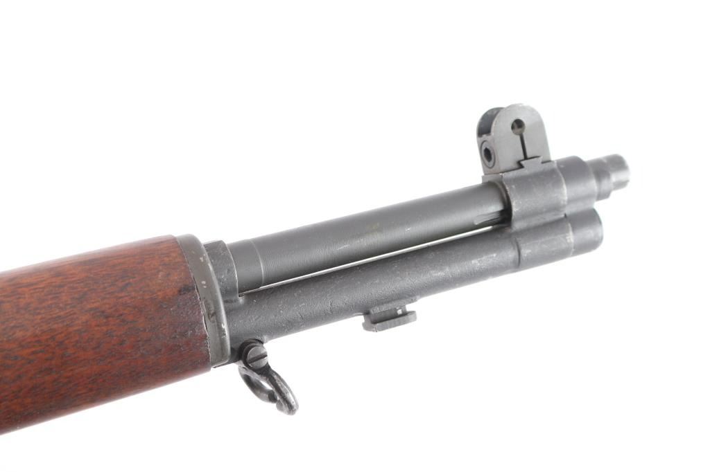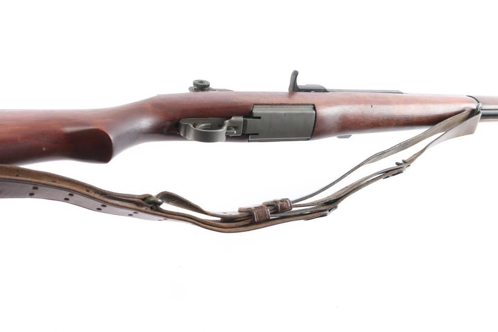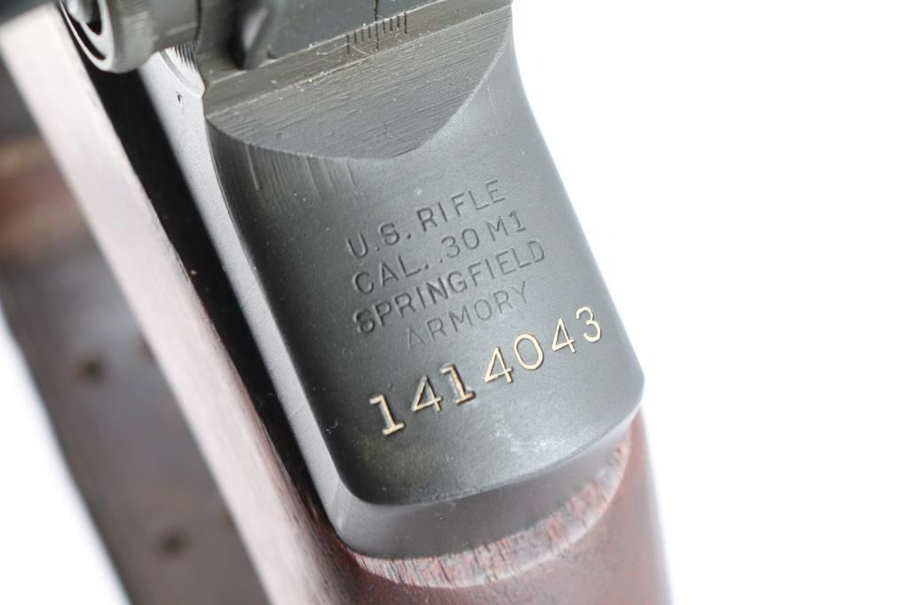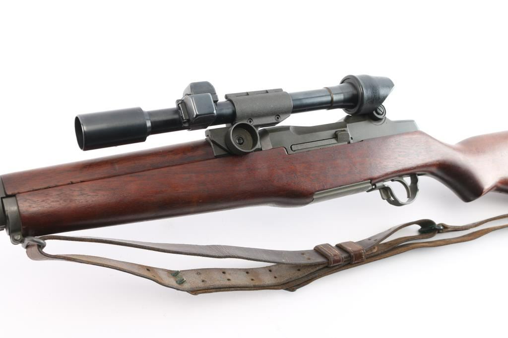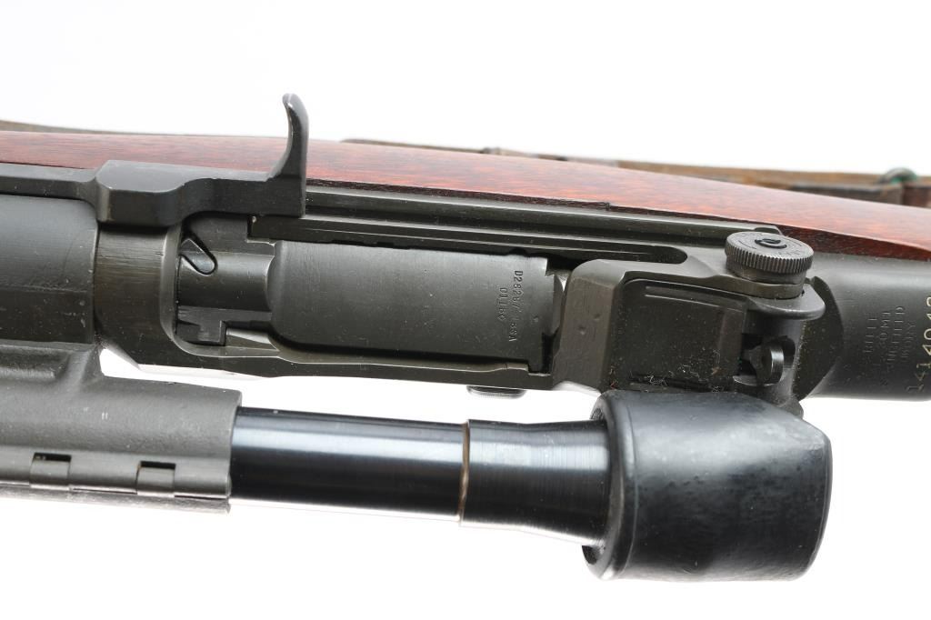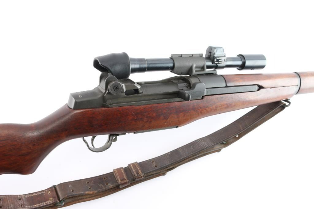 'Sniper-D' Rebuilt WWII era U.S. military clip-fed semi-automatic service rifle chambered in .30-06 Springfield, serial number dates to August, 1943. CMP rifle. Features a parkerized finish, 24" barrel marked "S-A 6-62" with large "T" & "U", blade front sight with flared protective ears, adjustable rear aperture sight marked "DRC", M84 fixed power scope with telescoping sun shade & rubber eye-piece, post-and-crosshair reticle. with correct M1D mount, smooth trigger, stamped trigger guard, bayonet lug, M1907 leather sling, stacking swivel, smooth walnut handguards and semi-pistol grip shoulder stock with trapdoor metal buttplate. The marker code “SA” is found on the bolt, barrel, operating rod, trigger housing. Receiver drawing number is "D 28291 17 "The stock is marked with circled “P” on the grip and "S.A. cartouche on left buttstock. Rifle retains approximately 94% of its military finish showing scattered handling marks/scuffs and some bright wear on/from the moving parts. Action is smooth, the bore is excellent, the optics are clear, the markings are sharp and the walnut stocks are very good with some dings. The rifle comes with USGI parts & accessories including brown leather cheek rest marked "MRT 1 52", no laces, bore brush, chamber brush, CMP manual, cleaning rod in sections, cleaning rod case, cartridge belt carrying case for scope, and M2 cone flash hider. All in original USGI packing except the cheek rest.