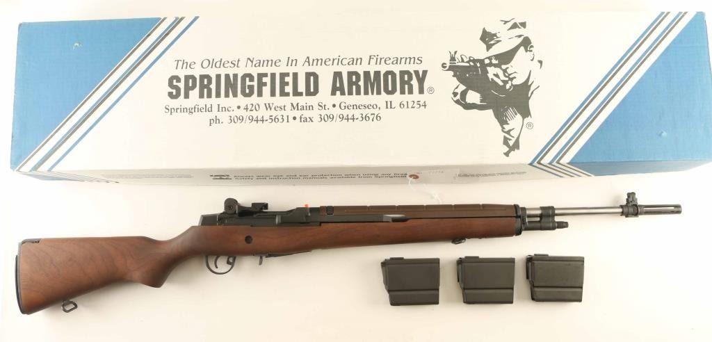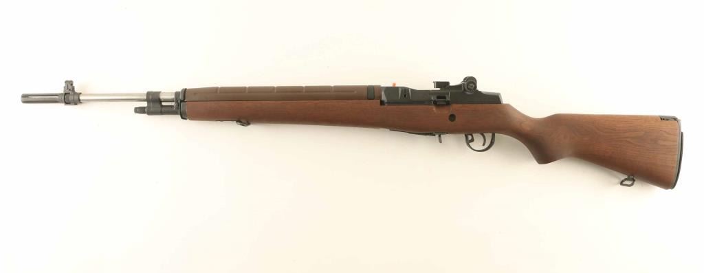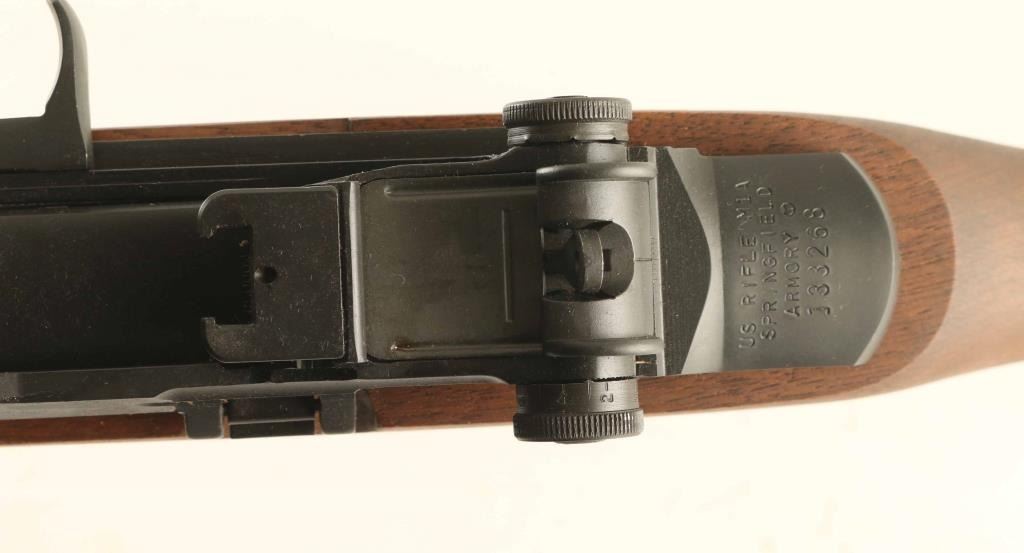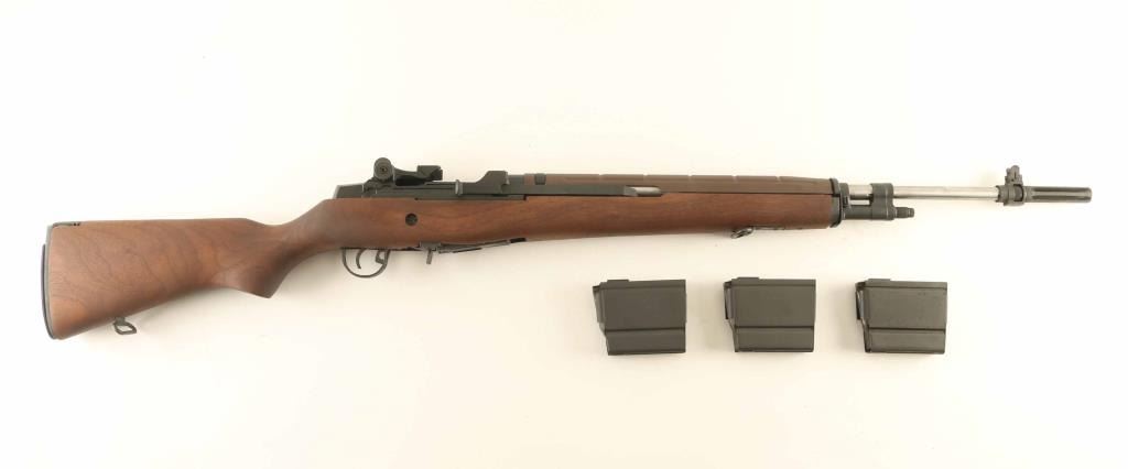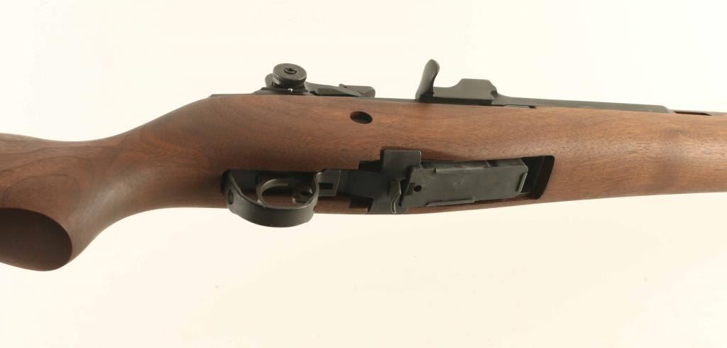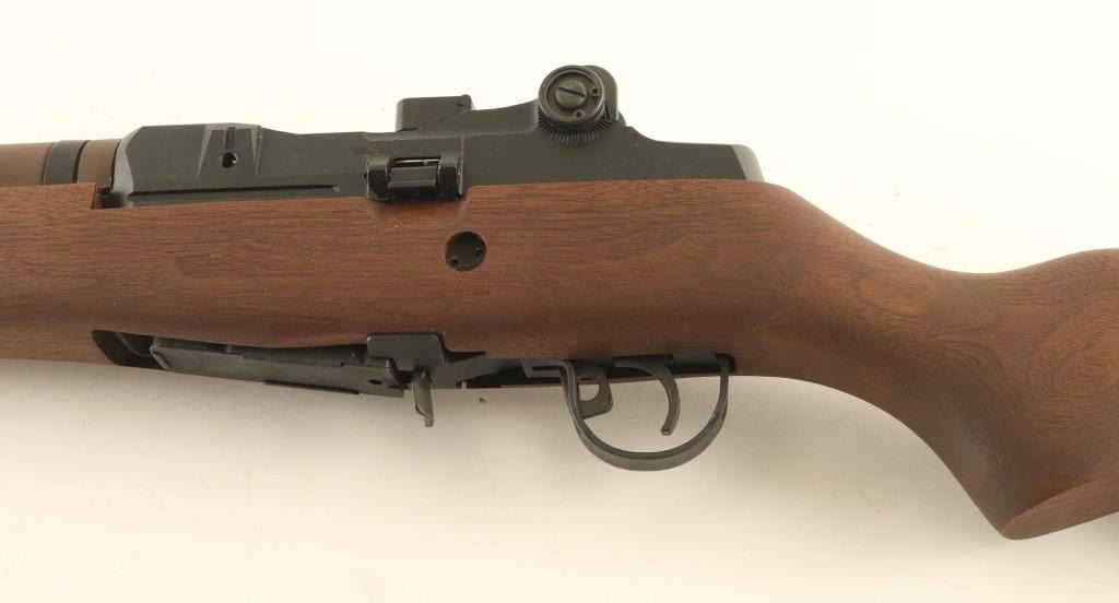 Semiautomatic rifle features parkerized finish, wood stock with butt trap, brown fiberglass handguard, 22" national match stainless barrel, flash hider, blade front sight with protective ears, adjustable rear peep sight, takes detachable magazines, manual safety. Buttplate has hinged cover over trap door. Bore is excellent. Overall condition is like new, with few signs of handling. Includes (2) flush fit 5 round magazines, (3) 10 round magazines, set of castle nut pliers (for removing flash hider), muzzle bore guide for cleaning rod, bolt roller greaser tool, leather target sling, scope mount, manufacturer manual, military manual for M14 rifles, original factory cardboard box. Condition is NRA Excellent - Like New *** Modern Firearm ***