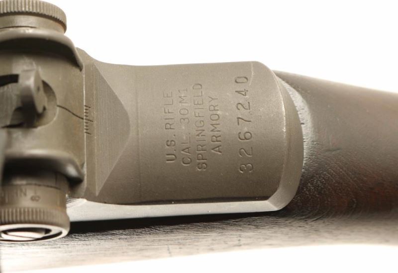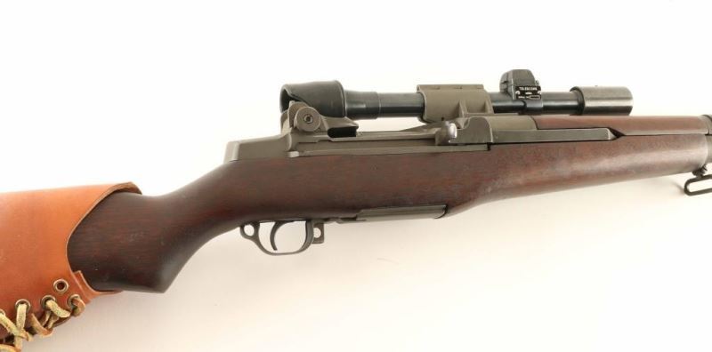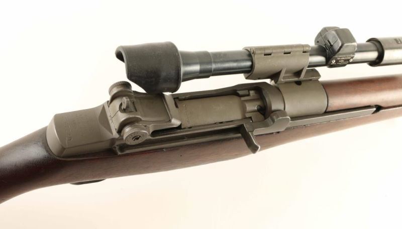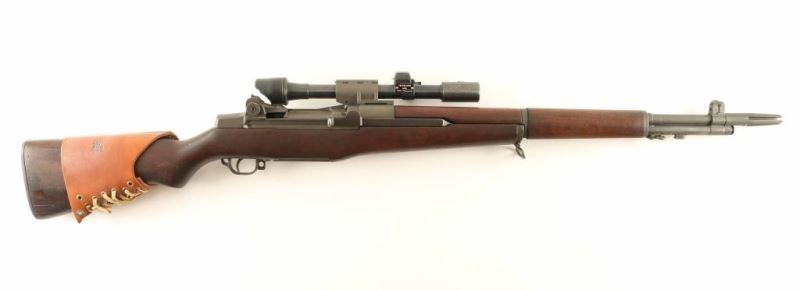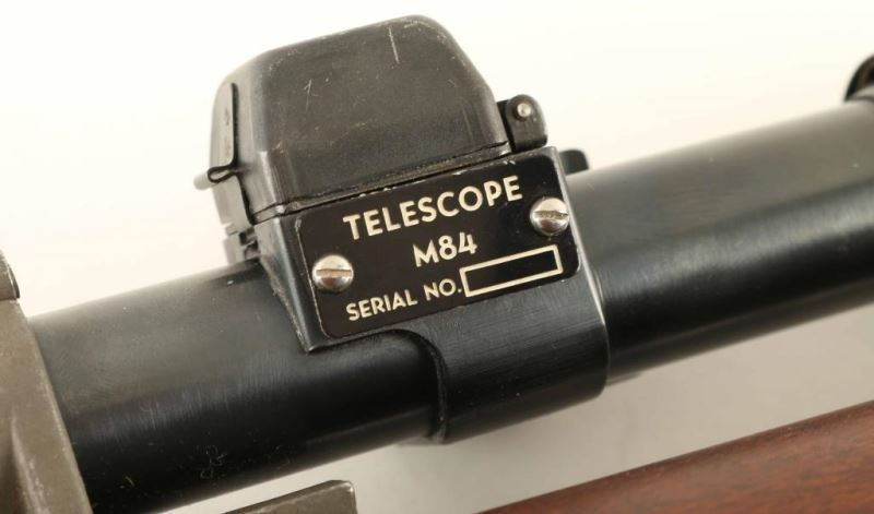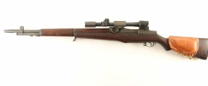'Sniper-D' U.S. Military contract semi-automatic sniper rifle chambered in .30-06 Springfield, circa 1944. Features a parkerized finish, 24" unmarked barrel, T-37 pronged flash hider, winged blade front sight, adjustable rear aperture sight, M84 fixed power scope with telescoping sun shade & rubber eye-piece, brown leather cheek rest marked "MRT/6-52", bayonet lug, smooth trigger, manual safety, sling swivels, checkered metal trapdoor buttplate, smooth walnut handguard and pistol grip shoulder stock with a 'P', circled "P" & squared S.A./H cartouche. Rifle retains approximately 95% of it's parkerized finish showing light wear on the moving parts, few handling marks and scattered rubs. Action is strong, bore is pristine, optics are clear and wood stocks are very good+ with dents, dings & a small circular repair near the buttplate on the left side. Condition is near NRA excellent. ***C&R Firearm***