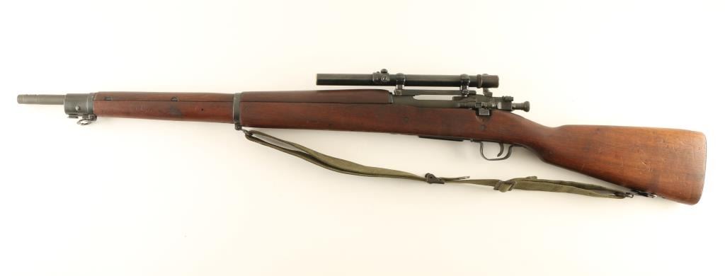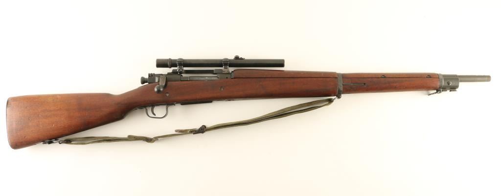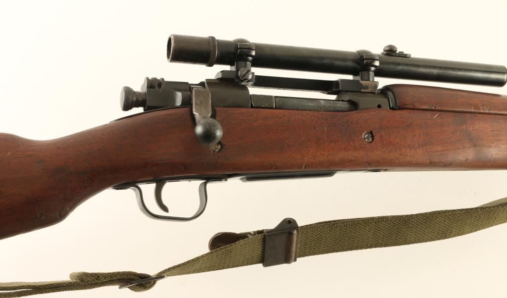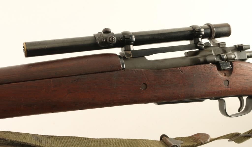 US military bolt action rifle features parkerized or blued metal parts, wood "scant" stock & handguard, 24" barrel, sling swivels, magazine cutoff, manual safety. Assembled from a "low numbered" 1903 receiver in a 1903A3 stock with WWII era stamped bands & bottom metal, fitted with a Redfield type base & rings to resemble a 1903A4 sniper rifle. Front sight removed, barrel dated 1944. Bolt handle has been reshaped to clear the scope. Safety does not engage without pulling back the cocking knob slightly. Bore is excellent condition. Metal parts retain 90% finish with thin areas or bare metal on bolt body, scope base, sharp edges. Wood is good overall with scrapes and scratches, gouge at butt. The Weaver G4 scope has fine crosshairs, view is a bit dim (might improve by cleaning lenses), mounted too far forward. Includes good condition US issue type green web sling. Condition is NRA Very Good *** C&R Firearm ***