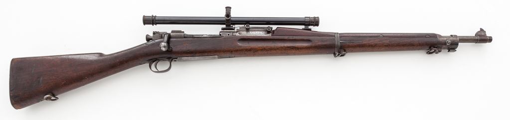 Springfield Model 1903 Bolt Action Rifle, #385398, .30-06 cal., 24'' Springfield barrel dated 10-09, finger groove cartouched walnut stock. Topped with a Winchester A5 scope with adjustable rear ring and leather scope covers. (Ref. the book, ''Collecting the American Sniper Rifle 1900 to 1945'', page 37 and color insert facing page 40, by Joe Poyer.) Condition is good with most of the original finish to the rifle having either flaked, toned, or worn off in general. Stock with moderate scuffs and oil darkening. Cartouche remains mostly visible. Action appears to have had some professional fitting, as rails show some polish and trigger is very crisp. Scope retains approx. 92% of its original finish with clear optics and thick crosshair reticles. Brown leather scope covers fit nicely. Crisp action, bright bore. Est.: $1,200-$1,800. (C&R)(Joe Poyer collection)