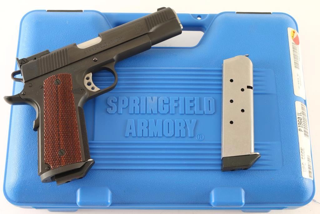 SN: NM163005 High quality 1911-A1 style single action semi-automatic pistol chambered in .45 Automatic. Features blued finish, 5" match grade barrel, dovetailed patridge front sight, adjustable rear window sight, dual cocking serrations on the slide, serrated adjustable trigger, skeletonized hammer, thumb safety, beavertail grip safety, push button magazine release, 7 round magazine, steel frame with knurled front strap, checkered flat mainspring housing with beveled magazine well, and two-piece checkered wood grips. Includes the original factory hard case with documents, tools, cleaning brush, lock, and spare magazine. Pistol exhibits approximately 99% of it's original blued finish showing few small handling marks with no other wear observed. Action is smooth, bore is pristine and wood grips are fine. Condition is near new in box. ***Modern Firearm***