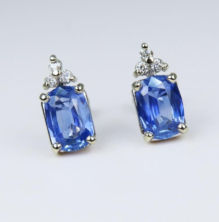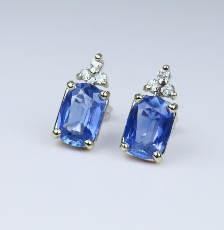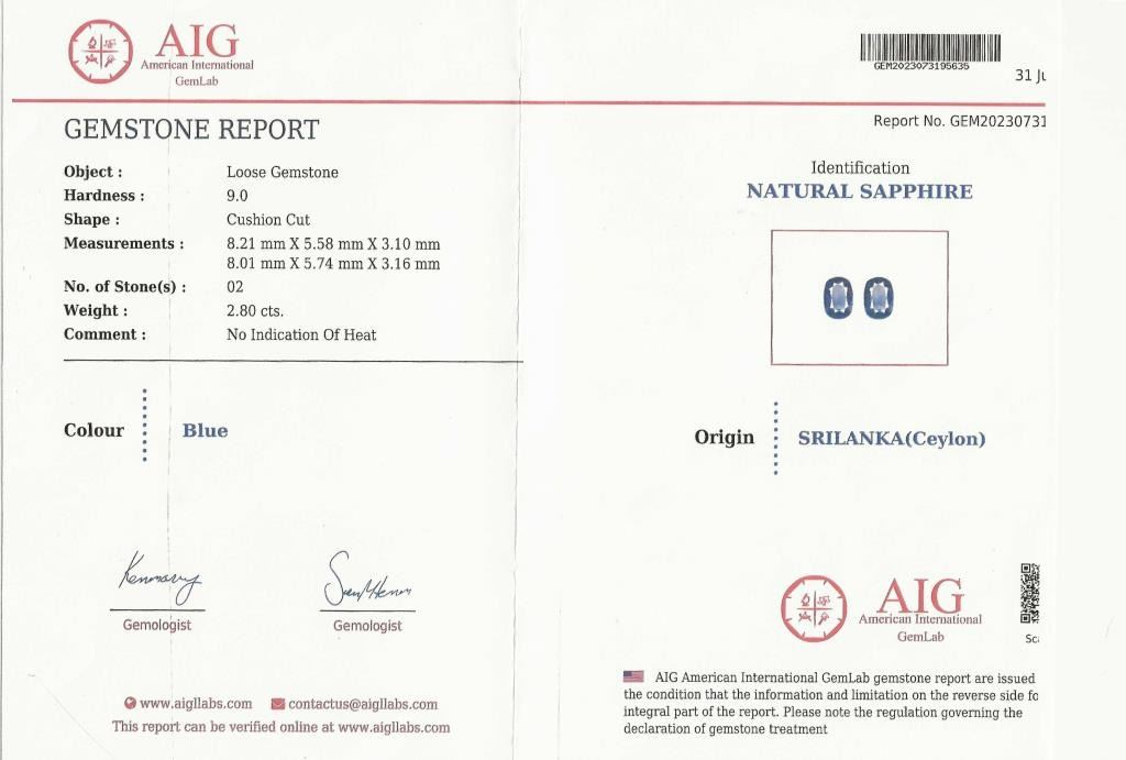 Striking Sri Lankan Blue Sapphire & Diamond Earrings featuring 2 Natural, NO Treatment Certified cushion cut Blue Sapphires weighing a combined weight of 2.80 carats accented with 6 round cut Diamond accents set in 14 karat white gold settings. Retail $8,000-$10,000.