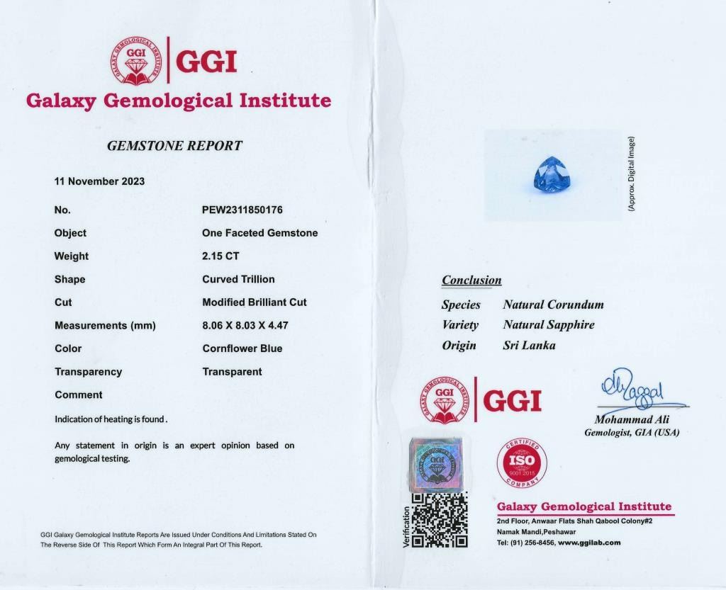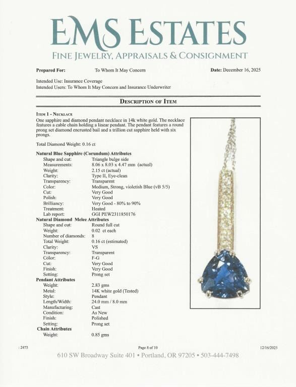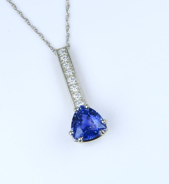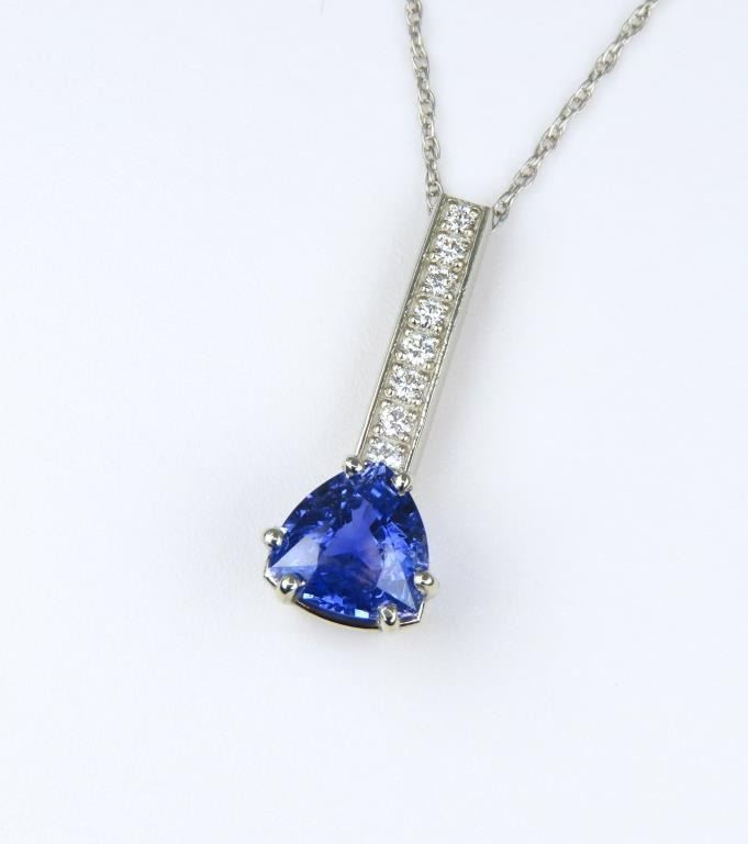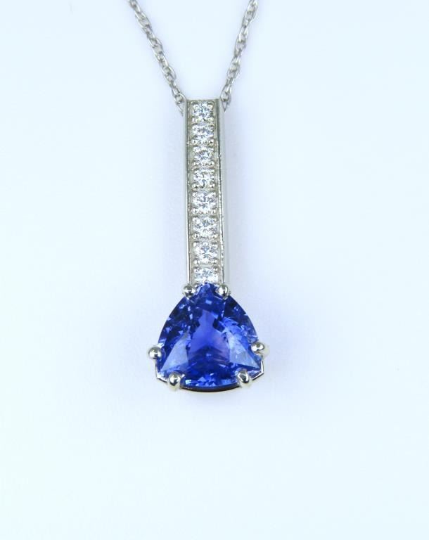 Brilliant, Fine Sri Lankan Blue Sapphire and Diamond Pendant featuring a Certified trilliant cut, vivid Blue Sapphire weighing 2.15 carats accented with 8 round pave set Fine Diamonds with F-G colors and VS clarity set in a custom designed 14 karat white gold setting. Full Retail Appraisal - $12,500.00.