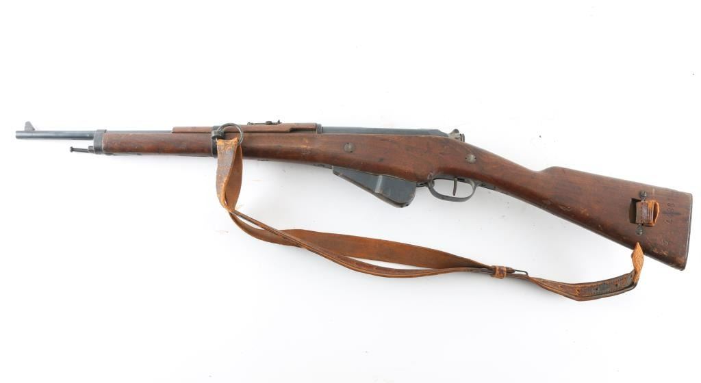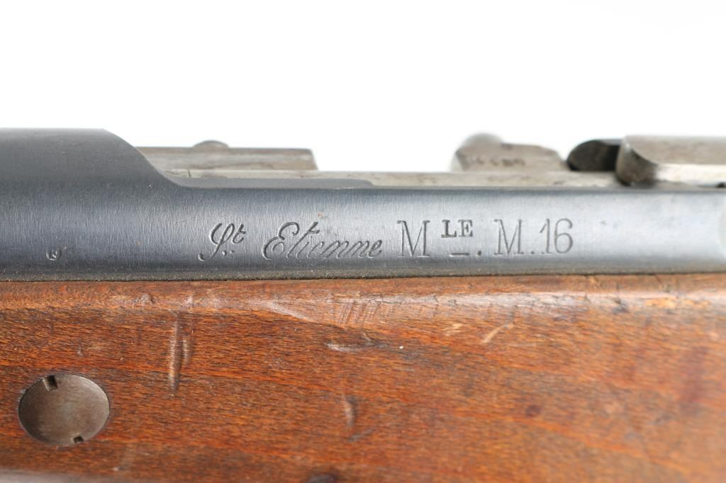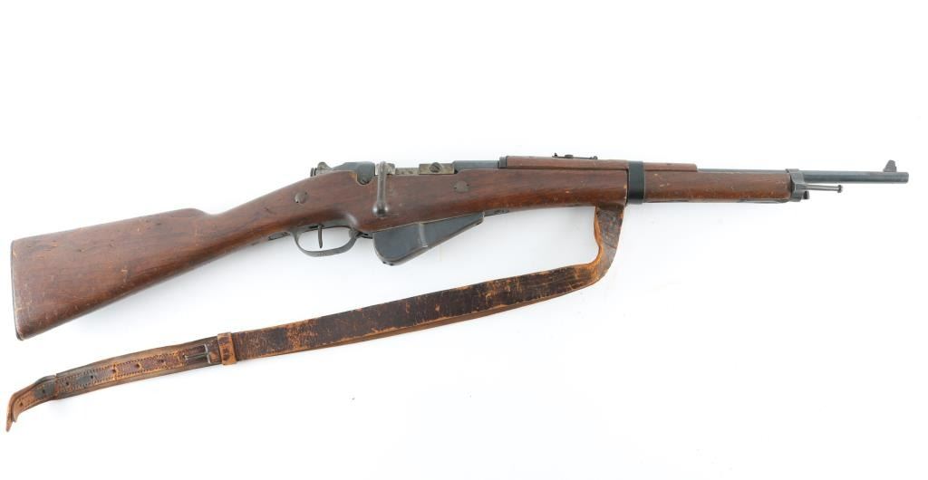 WW1 French military bolt action Berthier carbine with a 17-1/2" barrel. Has a non detachable 10-round box magazine. Serial numbers match on thee stock, triggerguard, and bolt, no others observed. Metal finish is good with small areas of surface rust on the magazine. Wood is good with the usual military dings/dents. Bore .is dark/rough. Original sling is very poor condition/broken. NRA Condition-Fair to Good. C&R Firearm