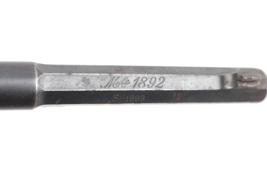 French military revolver chambered in 8mm Ordnance revolver cartridge. Manufactured 1892-1924 this one manufactured 1899. Features 6 shot cylinder that swings out to right side for loading and unloading, fixed sights,. 4.5 inch round/octagonal barrel, and lanyard ring on butt. Operates single and double action. Action works fine and lock-up is tight. Bore has rifling and moderate amount of light pitting. Metal finish has turned a gray mottled patina. Good condition wood grips with worn checkering and a few small dents. No import marks observed. Arsenal markings on right frame, "Mle 1892" on top of barrel, along with 'S 1899", French proof marks. All markings are crisp/clear. Condition is NRA Very Good as Antique Firearm.