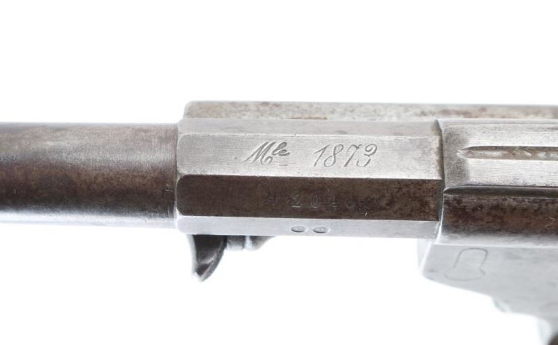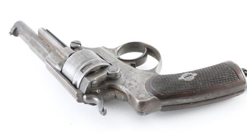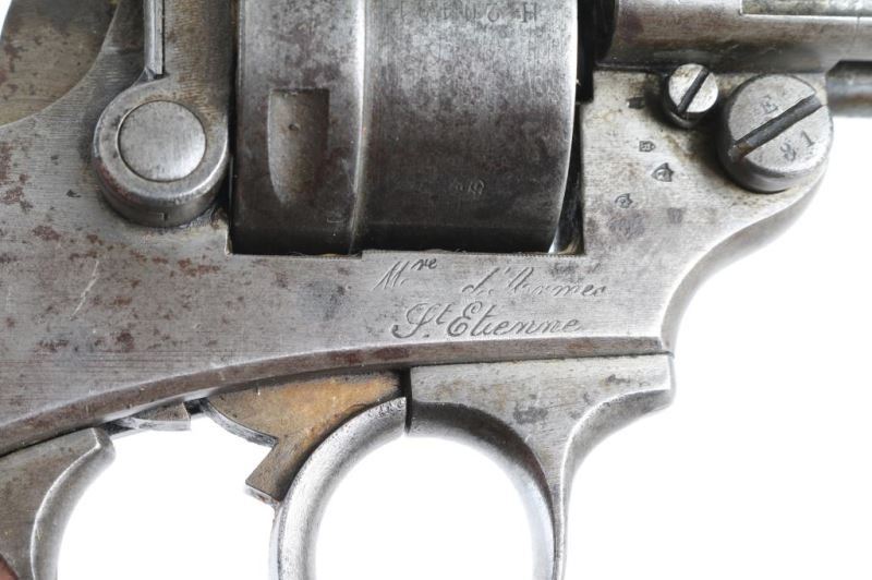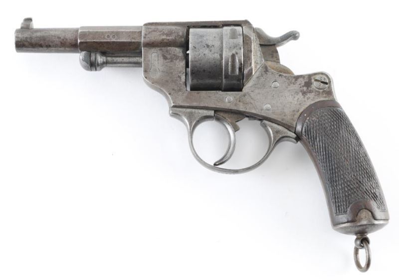 French military revolver features double/single action, solid frame side loading, 4.5" half-round half-octagon barrel, swing out ejector rod, fixed sights, 6 shot unfluted cylinder, checkered wood grips, lanyard ring at butt. Bore is fair to good, bright overall with dark grooves. Originally "in the white", metal surfaces show a mottled patina brown over bare metal, with darker color and rough textured patina in many places. Grips are good solid condition. Cylinder spins freely when trigger at rest, locks up fairly tight with trigger to rear. Action is smooth. Markings are shallow, readable. Condition is NRA Very Good *** Antique Firearm ***