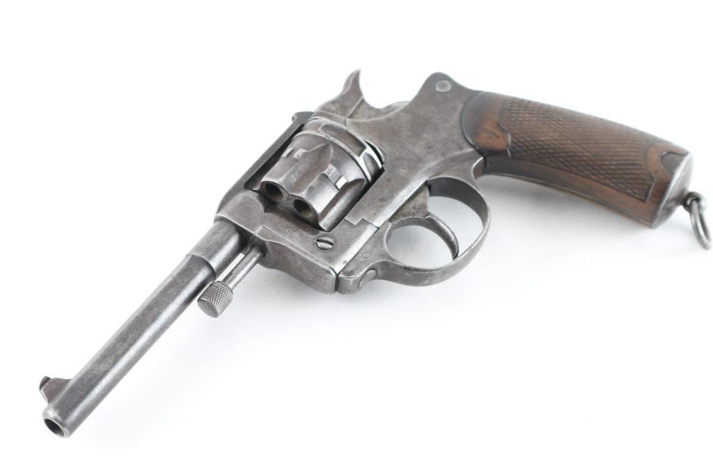 French military revolver chambered in 8mm Ordnance revolver cartridge. Manufactured 1892-1924. Features 6 shot cylinder that swings out to right side for loading and unloading, fixed sights, approx. 4.5 inch barrel, and lanyard ring on butt. Operates single and double action. Action works fine and lock-up is tight. Bore has rifling and moderate amount of light pitting. Metal finish has turned a gray mottled patina. Good condition wood grips with worn checkering and a few small dents. No import marks observed. Unmarked except for proof on the cylinder, 'St. Etienne' on right barrel, and '7' stamped into the left grip panel. Condition is NRA Good C&R Firearm.