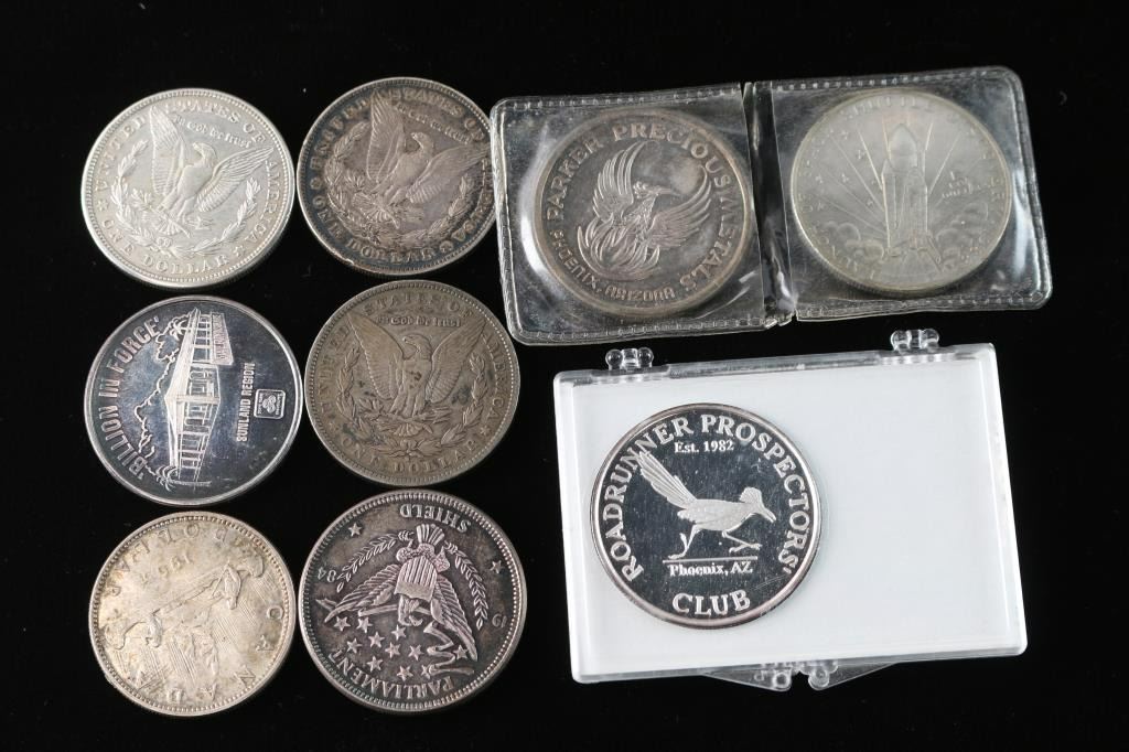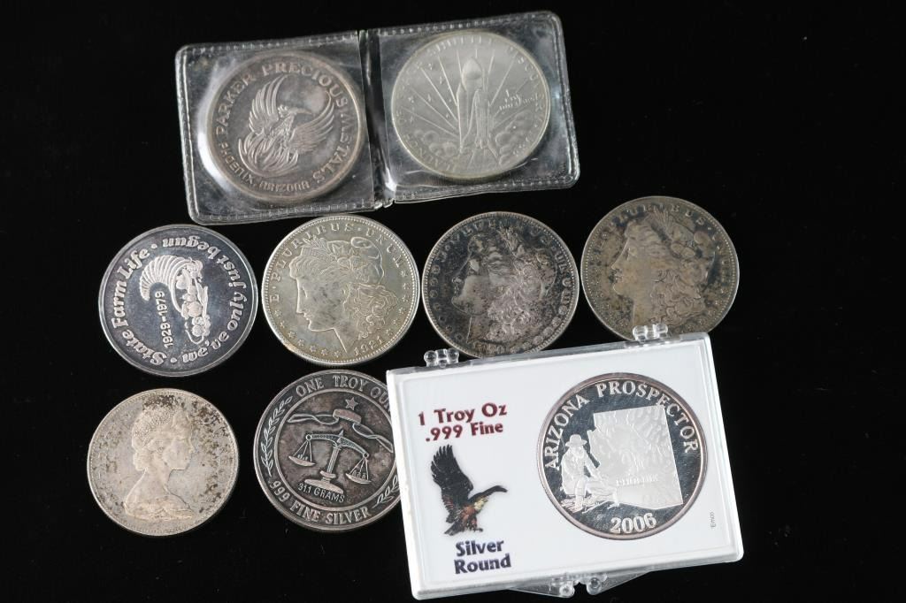Includes: 1879, 1896S, 1921S Morgan $1; 1965 Canadian dollar; 5 each 1 oz silver rounds.