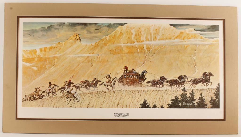 Double matted print of Norman Rockwell's "Stagecoach" depicting the attack and defense of a stagecoach on a mountain ridge. Image measures 25.5" x 11". In very good condition.