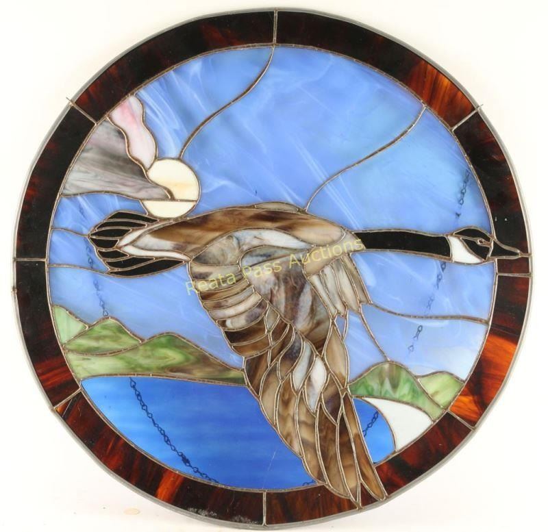 Depicting Canadian goose flying above a moonlit lake. Framed in brown glass with shades of blue, white, green and a hint of pink. Measures 25" dia. comes with chain for hanging.